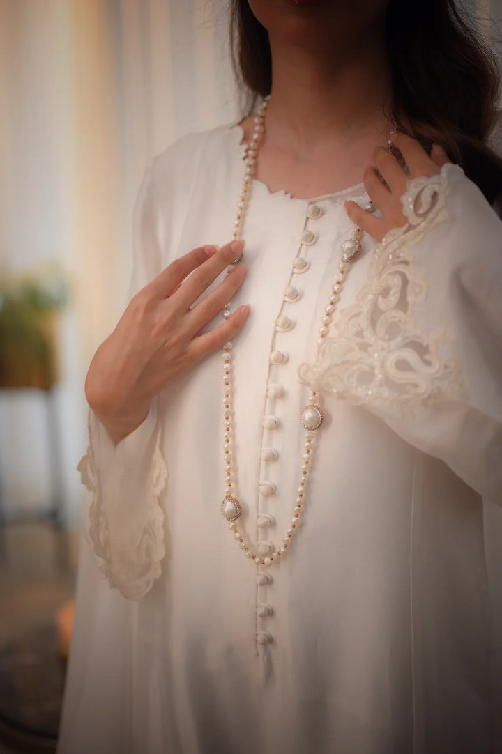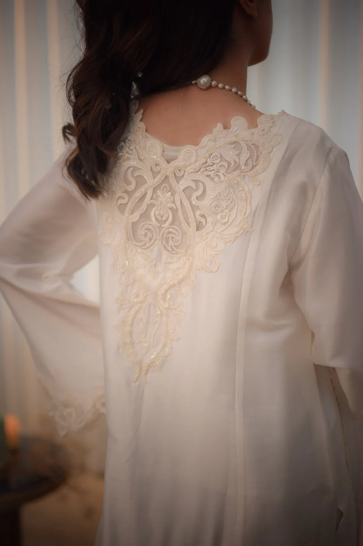 This outfit is a stunning all-white attire that blends elegance with timeless simplicity. The long, flowing shirt is made from fine silk, provides a soft and graceful drape. It features bell sleeves with intricate lace detailing on the cuffs. The hem of the shirt and the back also showcase beautiful lace embroidery, giving the ensemble a refined finish. It is paired with matching wide-legged trousers.