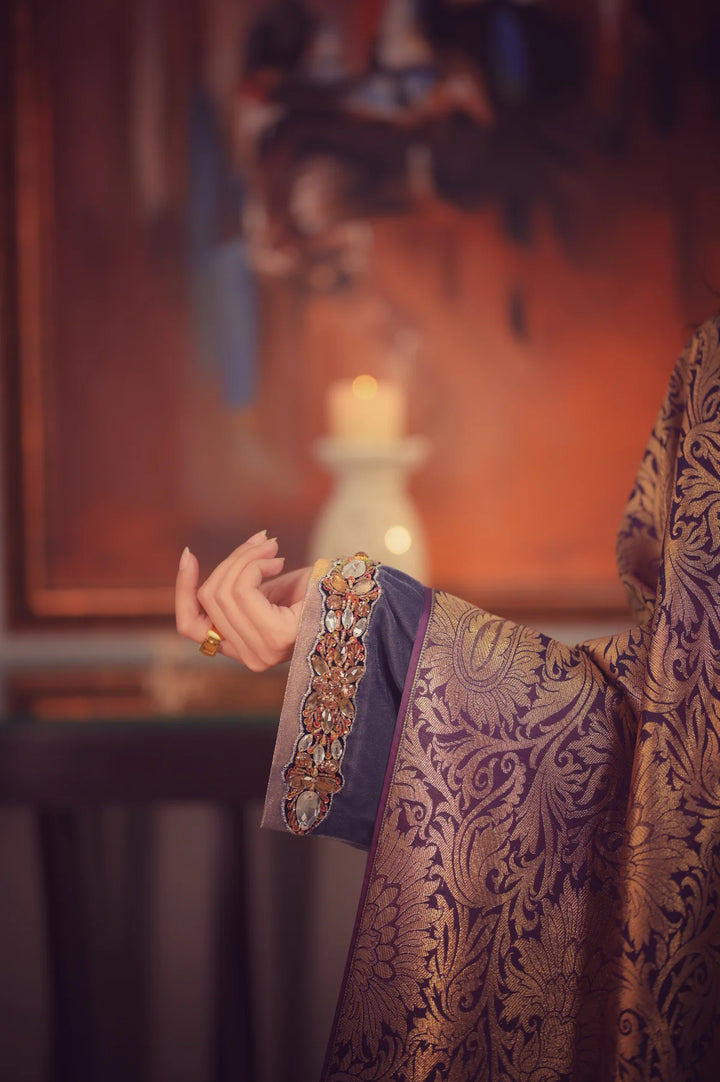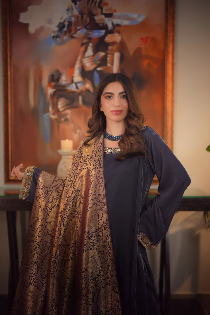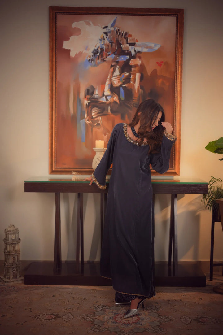 This elegant suit features a flowing grey long kameez crafted from pure velvet. The neckline and bell sleeves are beautifully embellished with intricate nag/ stonework. Paired with matching bell-shaped pants, adorned with embroidery along the hem, this ensemble exudes grace and sophistication.