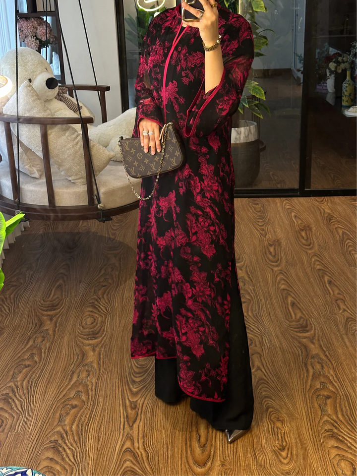 The Shirt: Features ethereal printed chiffon fabric. To balance its inherent translucency with wearability, a discreet partial lining is incorporated within the cropped body section and full sleeves, providing essential coverage without compromising the airy aesthetic.