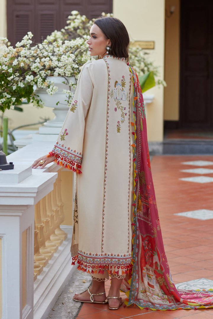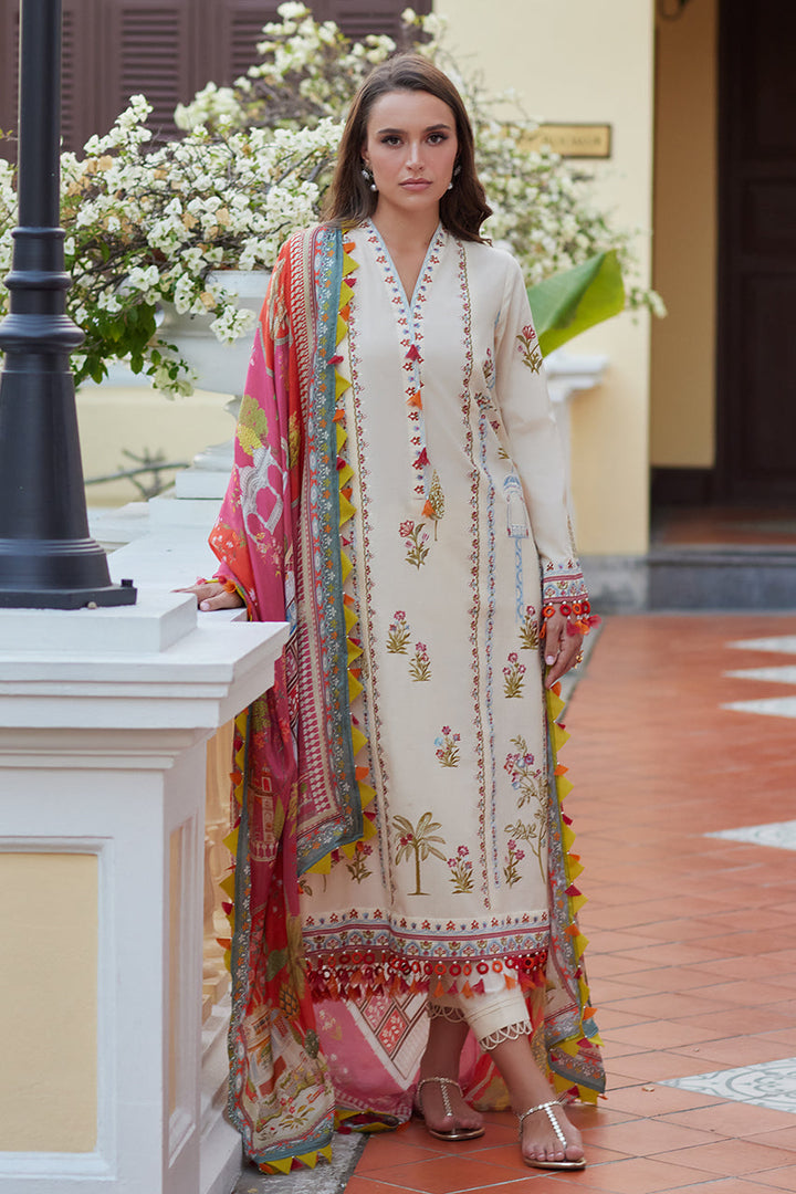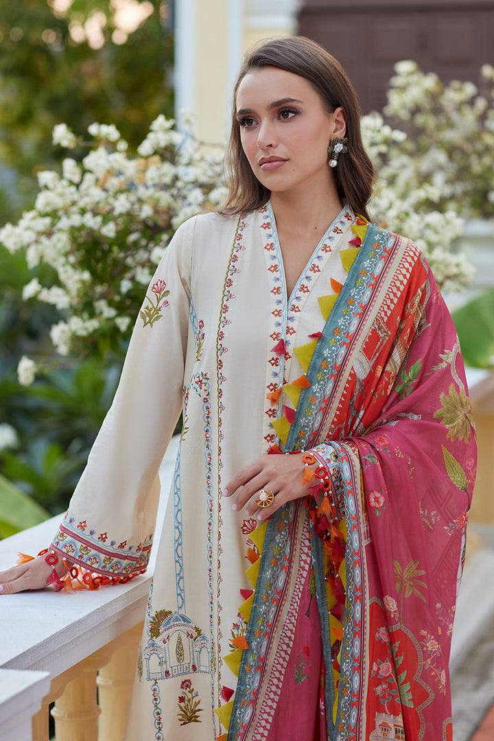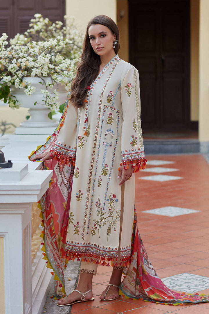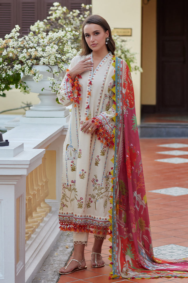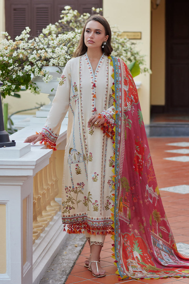 This embroidered shirt, inspired by Mughal miniature motifs, is elegantly presented in a stunning beige hue on our premium lawn fabric. Adorned with intricate multicolored embroidery, it is perfectly complemented by a pure silk printed dupatta and matching pants, creating a timeless and sophisticated ensemble.