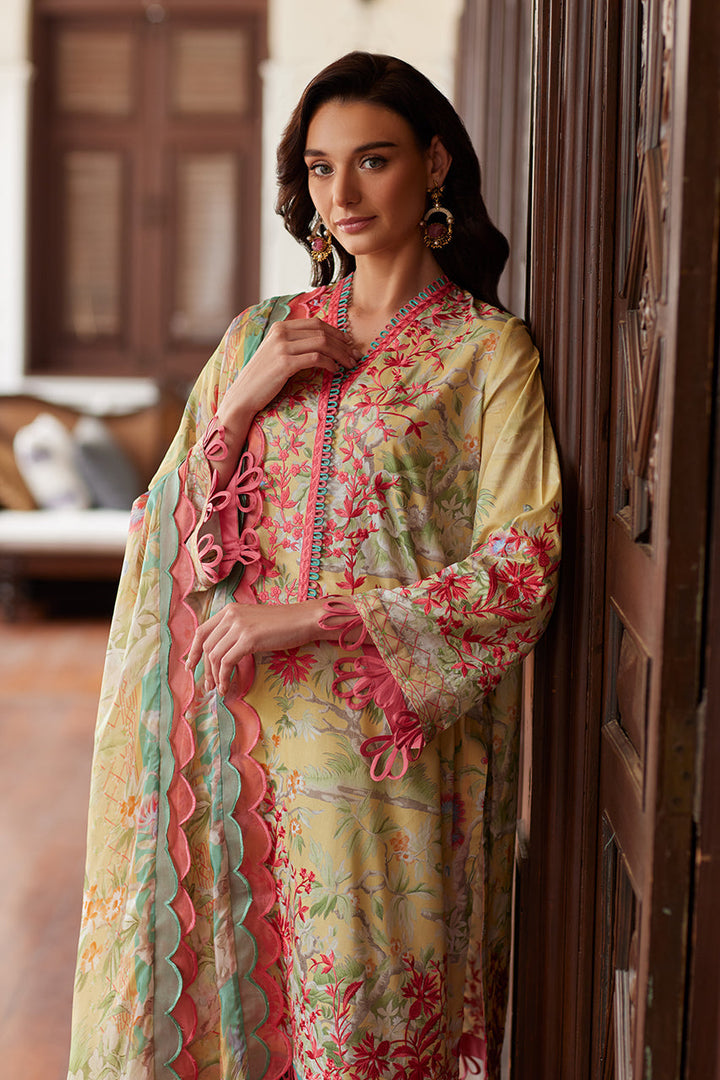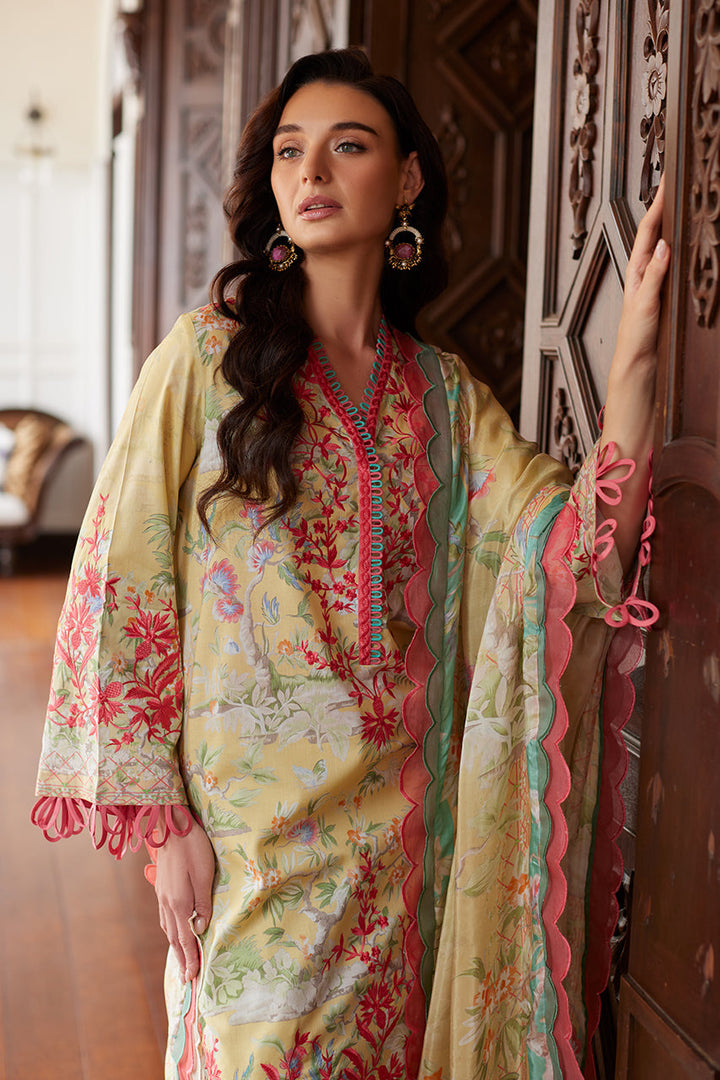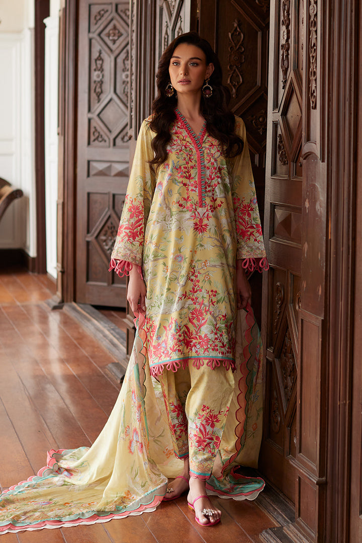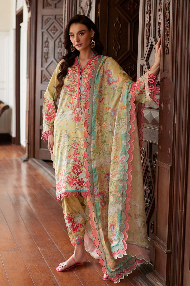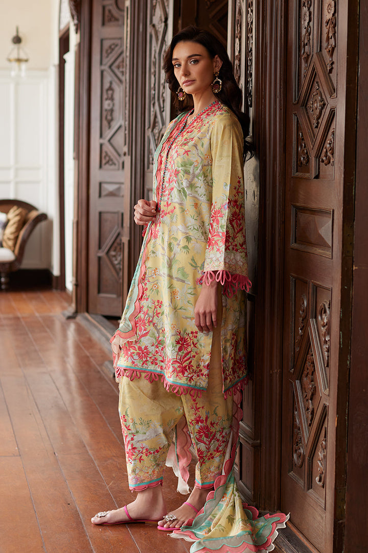 This digitally printed ensemble in a soft pale yellow showcases intricate embroidery inspired by Chinese florals and imagery. Exuding timeless elegance, it is paired with an embroidered shalwar for added sophistication. A luxurious pure silk dupatta completes the look, making it a perfect choice for both day and evening occasions.