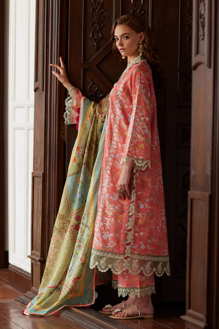 This peony pink printed shirt, adorned with intricate embroidery on premium lawn, draws inspiration from