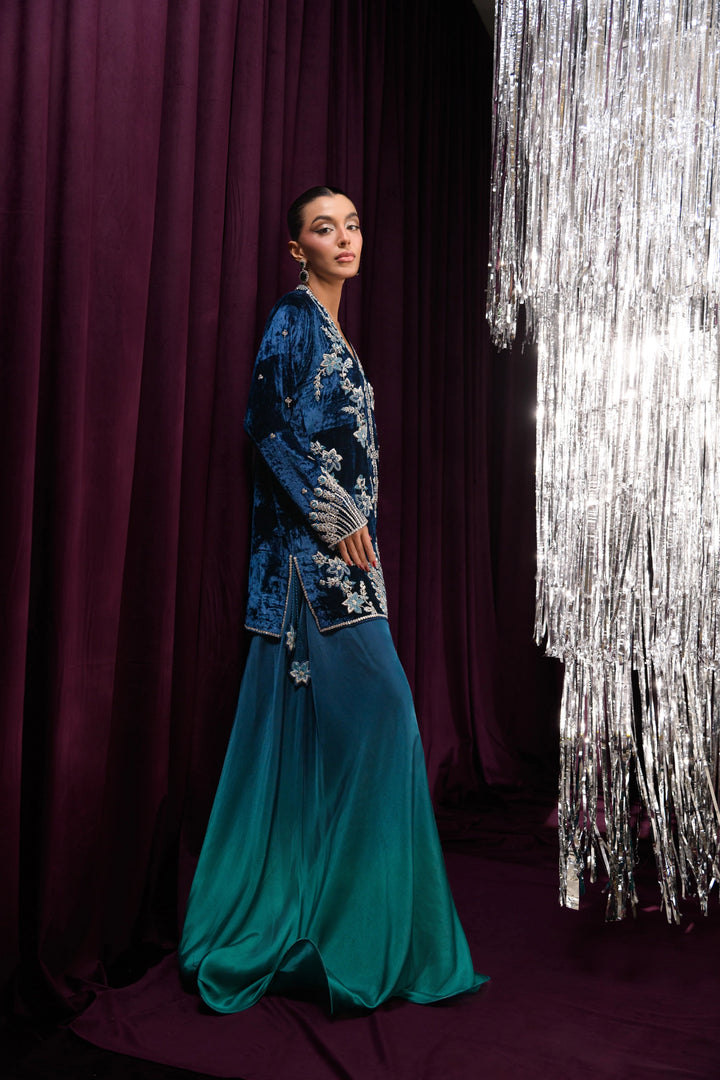 Immerse yourself in refined sophistication with Oceanic from our Velvet Luxe MARA collection, featuring a short cobalt blue jacket-style shirt paired with flowy pure medium silk pants. The shirt, crafted from pure velvet, is lavishly embellished with dabka and kora embroidery in silver tones, accented with hints of blue resham for a striking, contemporary effect. Intricate tassels adorn the side slits, adding delicate movement and charm. The ombre-toned flare pants in shades of blue and aqua green complete the look.