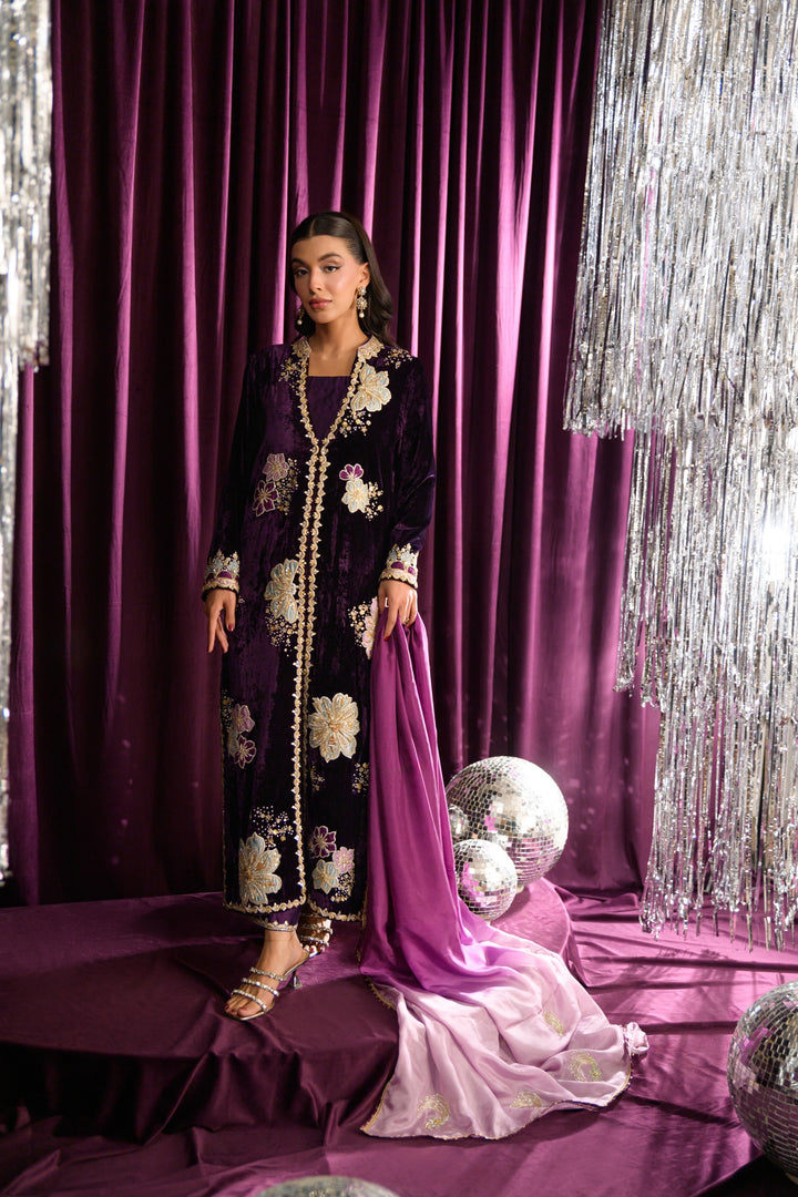 Step into refined elegance with Petal from our Velvet Luxe MARA collection, a plum-toned long shirt paired with pure sheesha silk izaars. Crafted from pure velvet, the shirt is lavishly embellished with dabka, kora, resham, and appliqué work in delicate shades of ice blue, plum, and lavender, forming exquisite floral and petal motifs. The design is tailored in a long coat-style silhouette, making it a graceful choice for the breezy season. The ensemble is completed with a plum-toned dupatta in pure medium silk, adorned with intricate all-over embroidery for a refined finish.