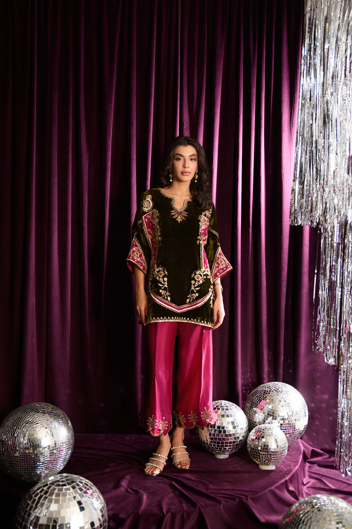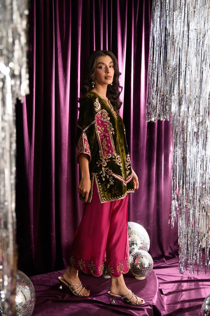 Step into effortless elegance with Zucchini from our Velvet Luxe MARA collection. This olive-toned, short cape-style shirt is paired with pure sheesha silk izaars, creating a chic and contemporary silhouette. Crafted from pure velvet, the shirt is richly adorned with dabka, kora, resham, and appliqué work in delicate shades of pink, featuring striking fuchsia appliqués with intricate golden detailing.