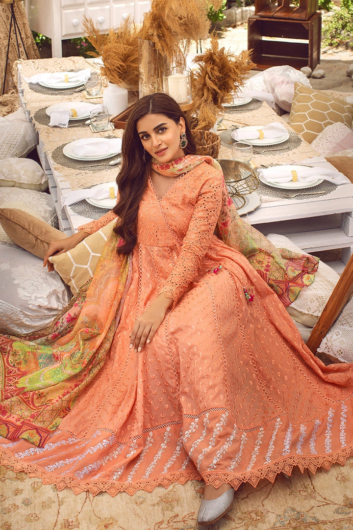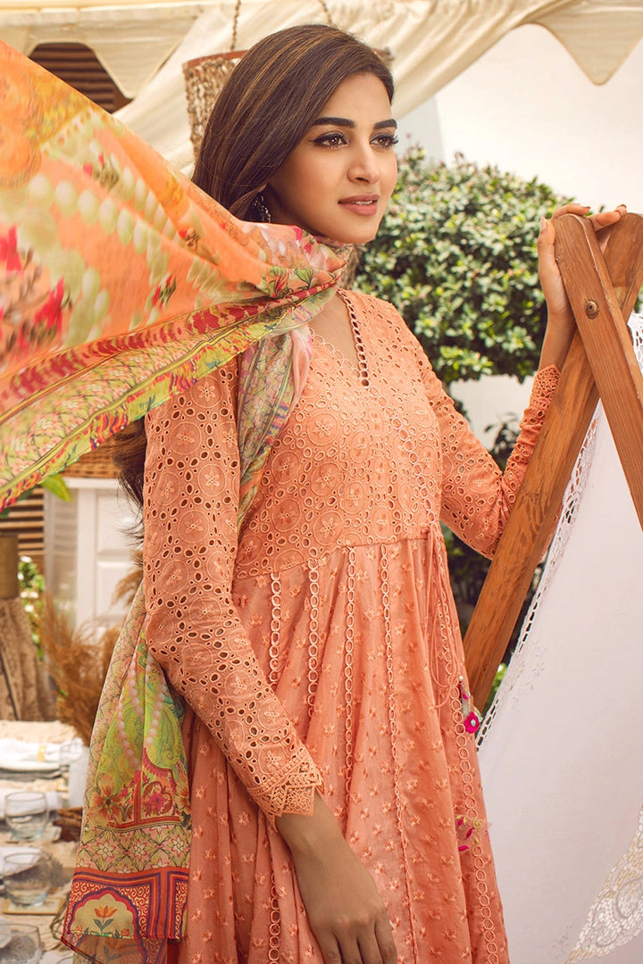 Pale orange schiffli Anarkali with pants and a silk digital printed dupatta.