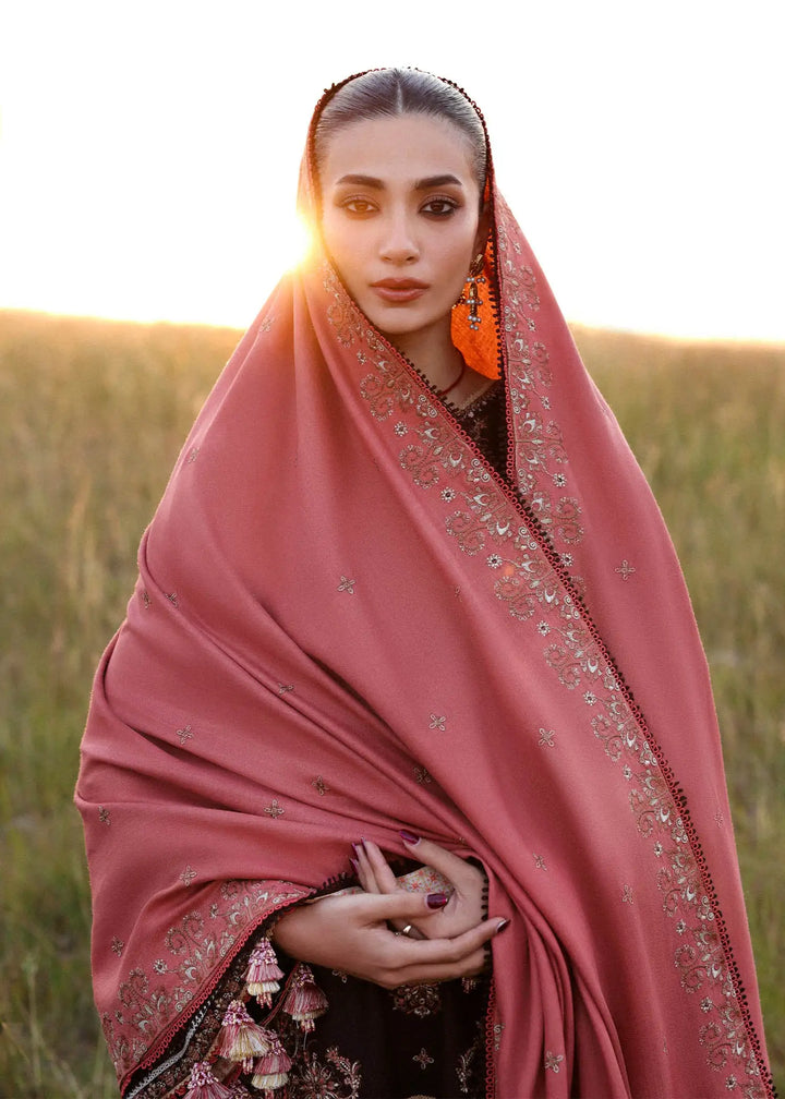 A perfect blend of modern charm and winter elegance — this mid-length brown khaddar shirt features a chic V-shaped embroidered neckline with ornate motif spray across the panels, enhanced by a bold, intricately embroidered hem and richly detailed sleeves. Paired with fully embroidered culottes and a contrasting peach wool shawl adorned with exquisite embroidery and a heavy pallu, this ensemble exudes warmth, sophistication, and contemporary grace.