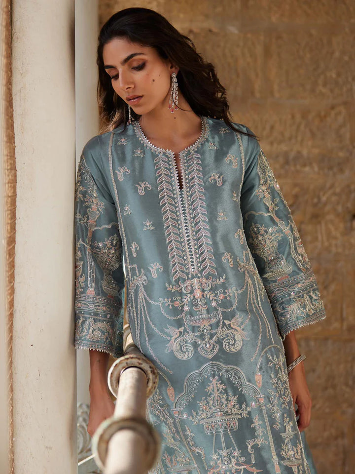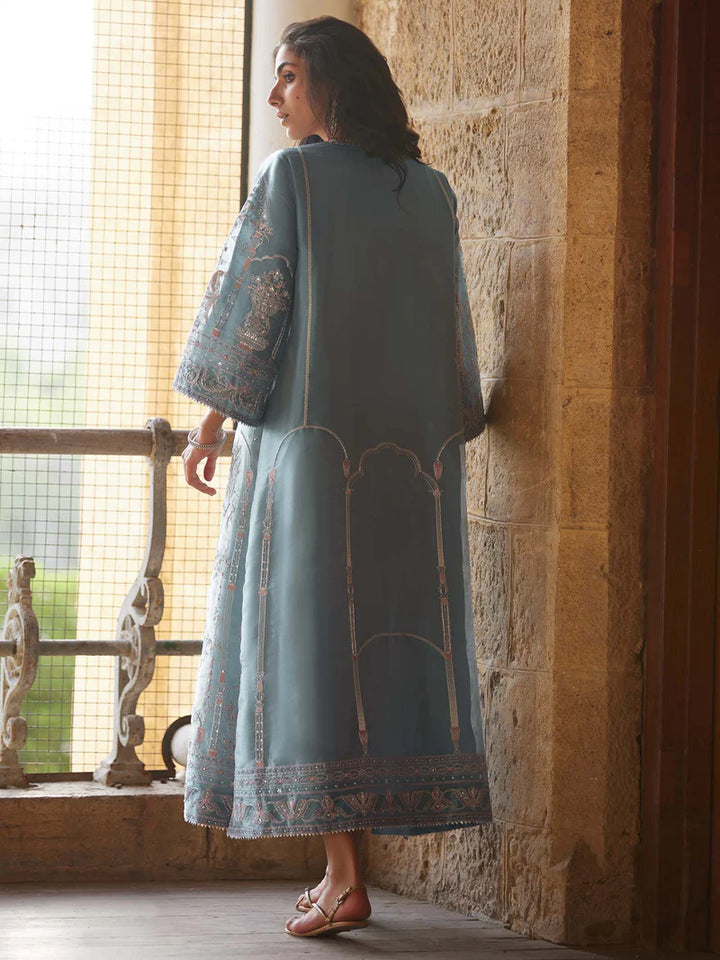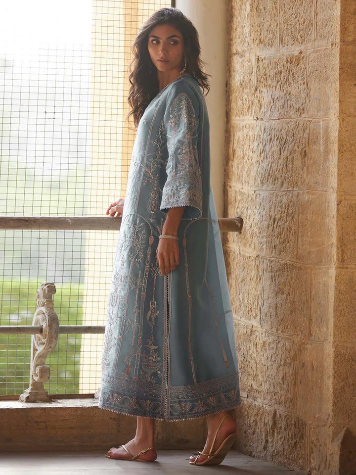 Elevate your festive wardrobe with our blue tissue Jalabiya. It showcases two tone resham embroidery with zardozi work inspired by chintz Mughal motifs. Perfect for moonlit occasions, this is the perfect addition to your festive wardrobe.