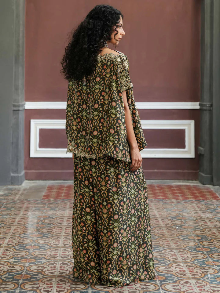 Flattering and feminine, our off-shoulder top is versatile and can be worn as a boat neck, too. Cut from black rod silk, it features print all over in complementing hues inspired by Mughal motifs and is further accentuated with zardozi work. It is paired with a matching culottes for an effortless look.
