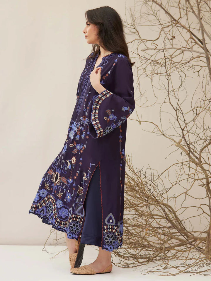 Ideal for the new season, our midnight blue Raya kurta features Uzbeki and folksy floral motifs adorned with chain aari embroidery in hues of tonal blues and mousy brown. Pair it with our midnight blue izaar as seen here.