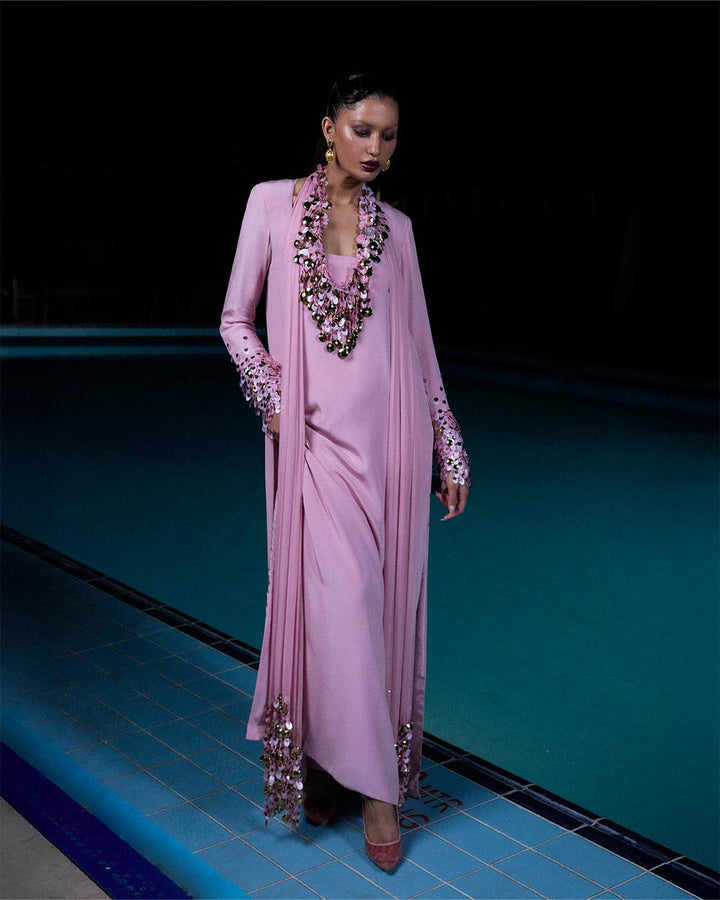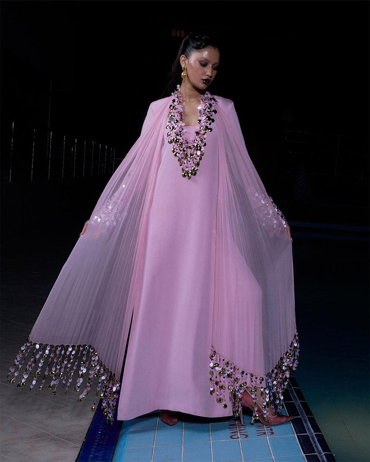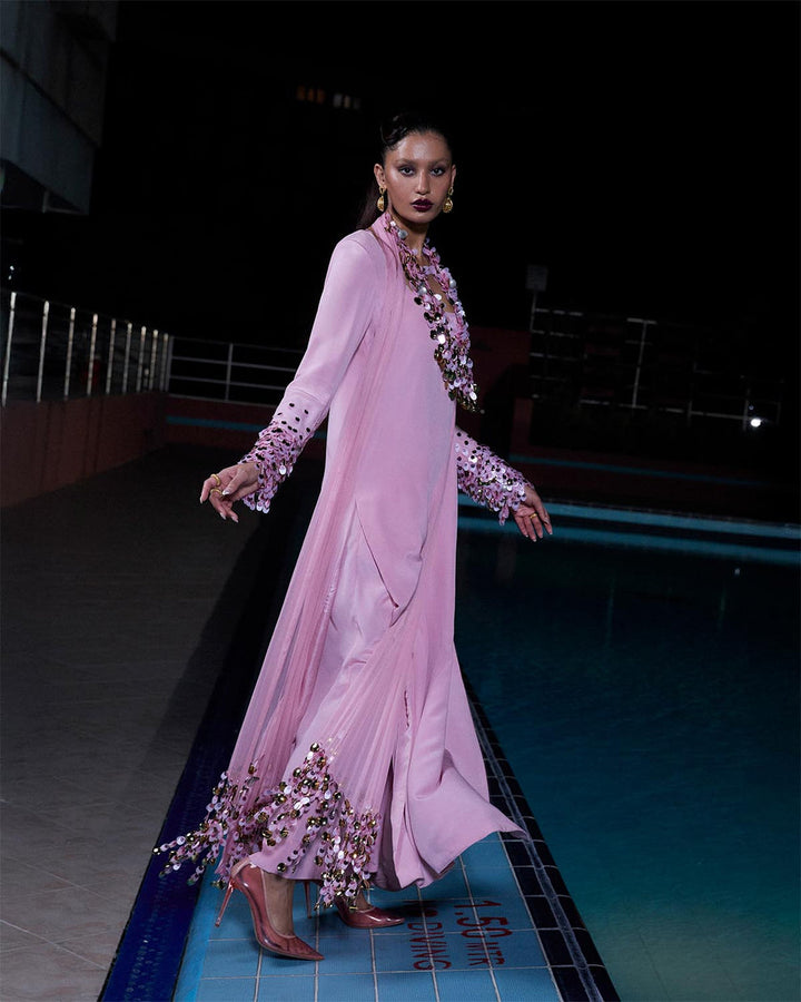 Crafted in pure grip, this dusty pink shirt features an elegant handi-shaped neckline The sleeves are intricately embellished with gold metallic coins and gradient pink sitara, adding a beautiful shimmer. Paired with a chiffon dupatta that mirrors the embellishment and finishes in long tassels, the ensemble exudes refined charm and subtle festivity. (Necklace is a separate accessory)