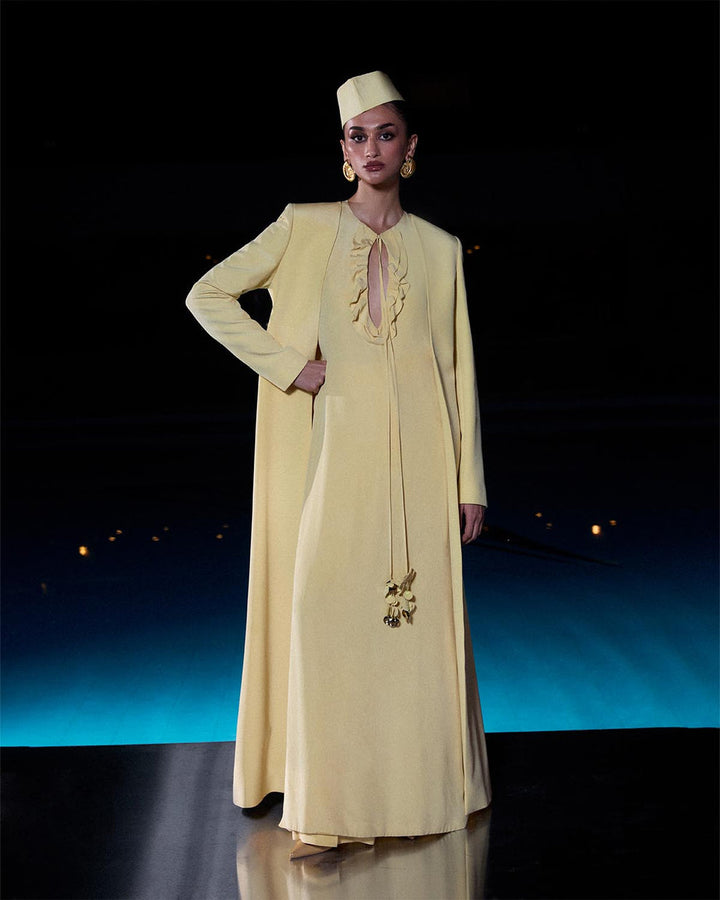 A long tailored butter yellow jacket with a full length butter yellow grip shirt featuring a layered ruffle neckline accented with soft fabric floral tassels glistening with metallic gold coins in between, exudingg delicate feminity. Paired with tailored grip trousers for a sleek silhouette.