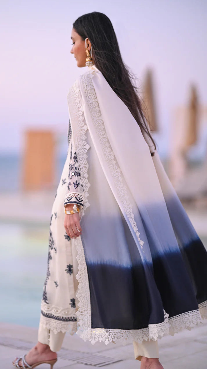 An ethereal statement of elegance—this off-white masterpiece is adorned with intricate navy and light blue embroidery, gracefully unfolding across a pristine canvas. The timeless straight silhouette is elevated with exquisite thread and mirror work, delicate floral lace, and impeccably detailed borders, exuding an air of quiet luxury.