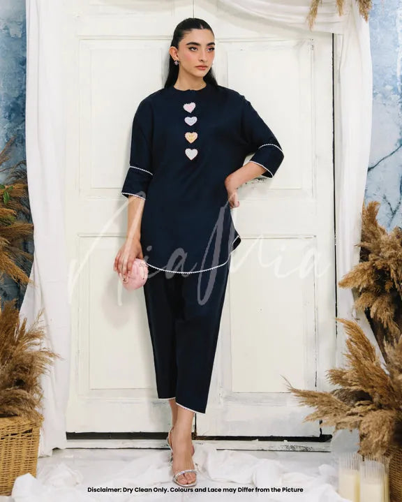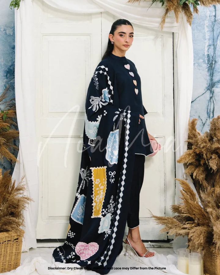 A navy blue pashmina two-piece outfit paired with a matching navy shawl decorated with soft pastel heart appliqués and geometric detailing, giving the look a cute yet refined touch.