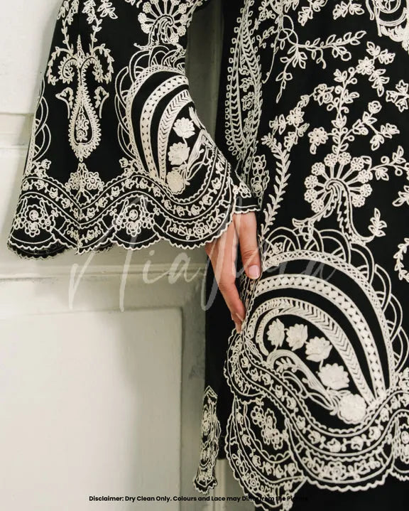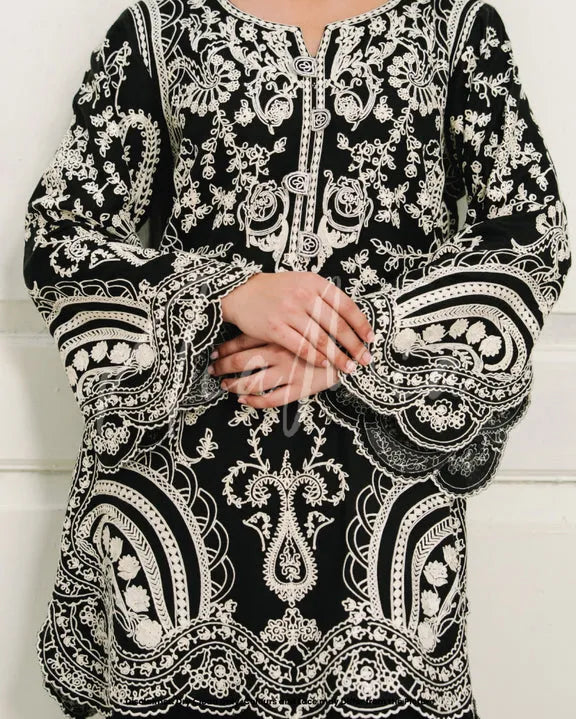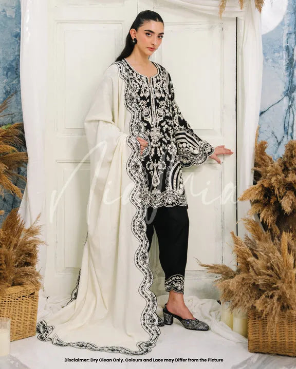 A pashmina black embroidered kurta paired with matching black skinny shalwar, featuring intricate white aari work. It’s styled with an ivory shawl edged in detailed black embroidery, adding a rich and elegant contrast.