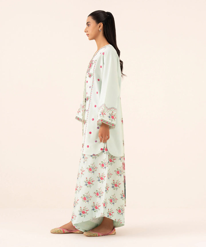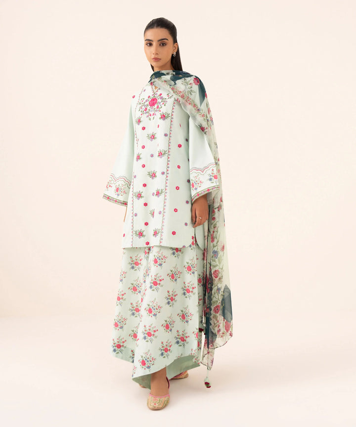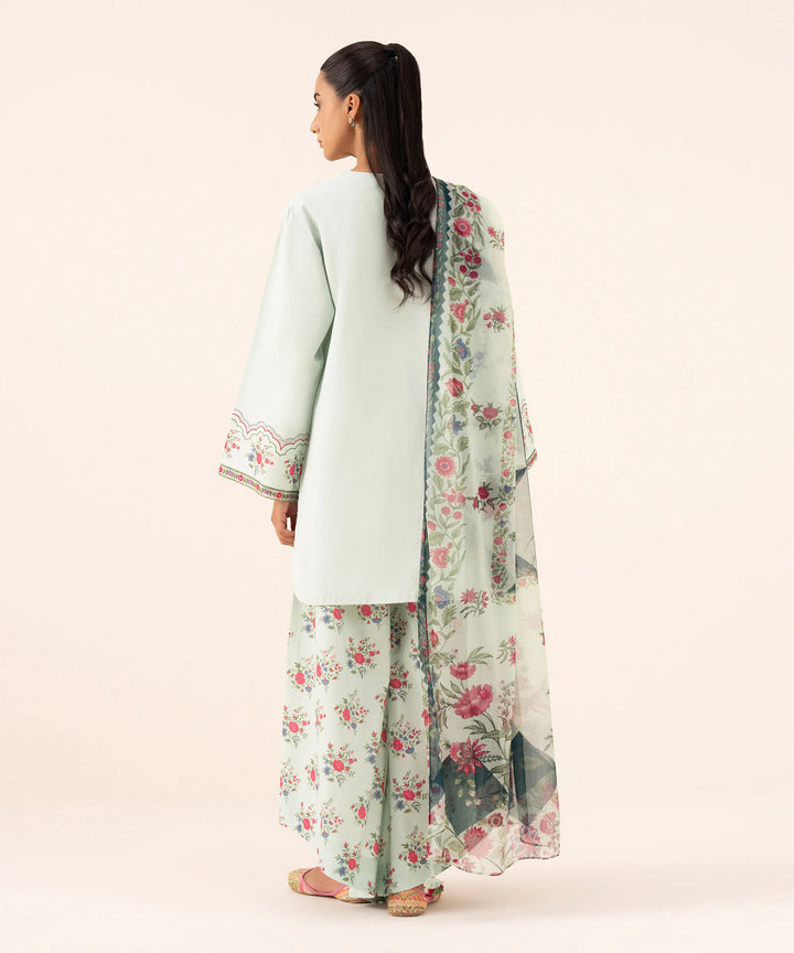 Elevate your style with our mint cream three-piece embroidered ensemble featuring a cotton viscose shirt paired with a blended chiffon dupatta and cotton trousers.