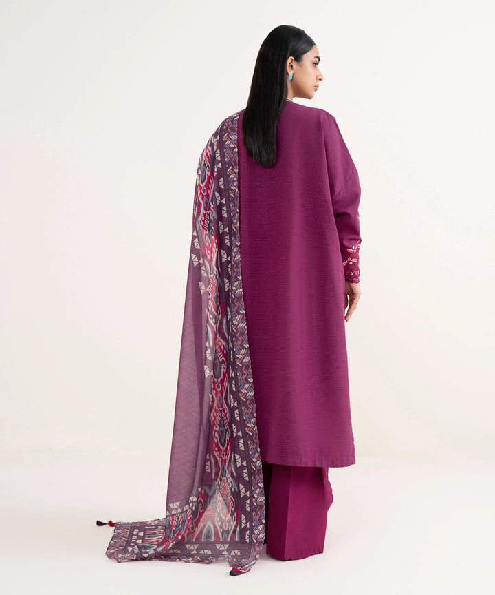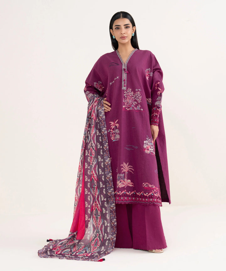 Elevate your style with our three-piece embroidered mulberry ensemble featuring a dobby shirt paired with a manaar dupatta and cotton trousers.