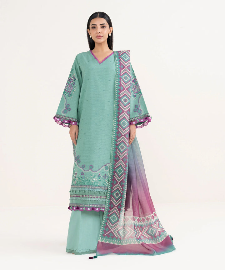 Elevate your style with our three-piece embroidered jade green ensemble featuring a dobby shirt paired with a manaar dupatta and cotton trousers.