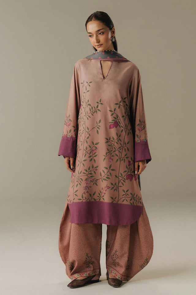 A dusty pink shirt inspired by modern chintz patterns, paired with matching dusty pink trousers featuring delicate block print details. The ensemble is beautifully complemented by a shawl in soft shades of gray and pink, creating a refined, feminine, and effortlessly graceful look.