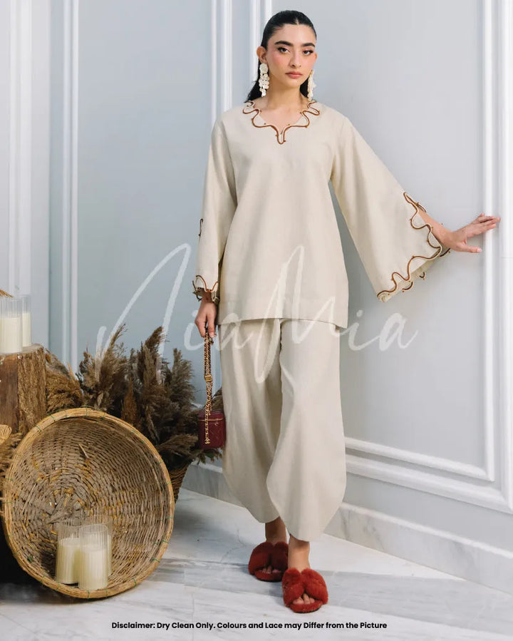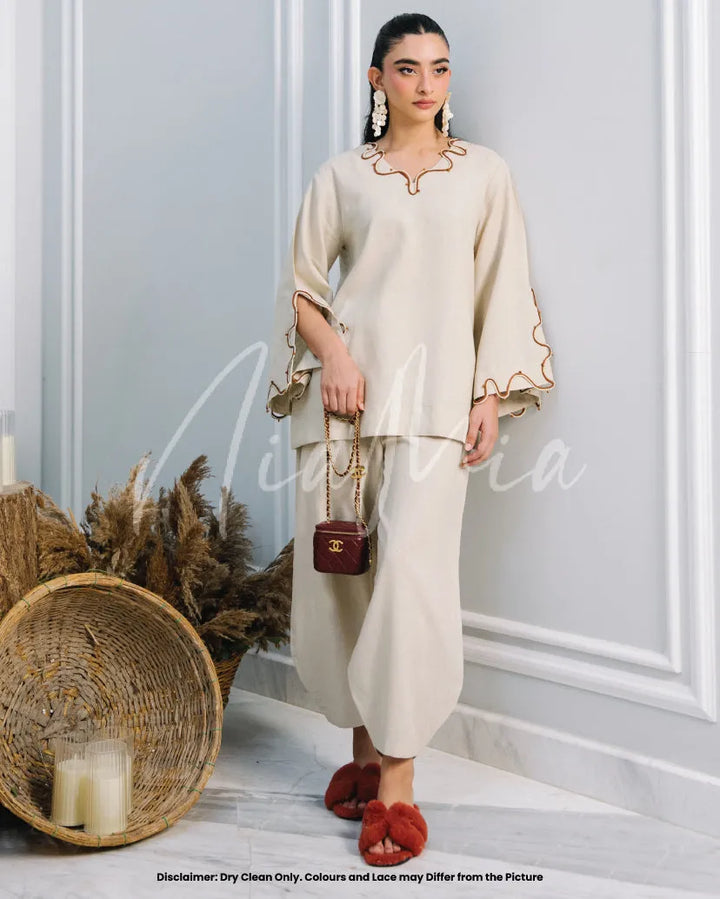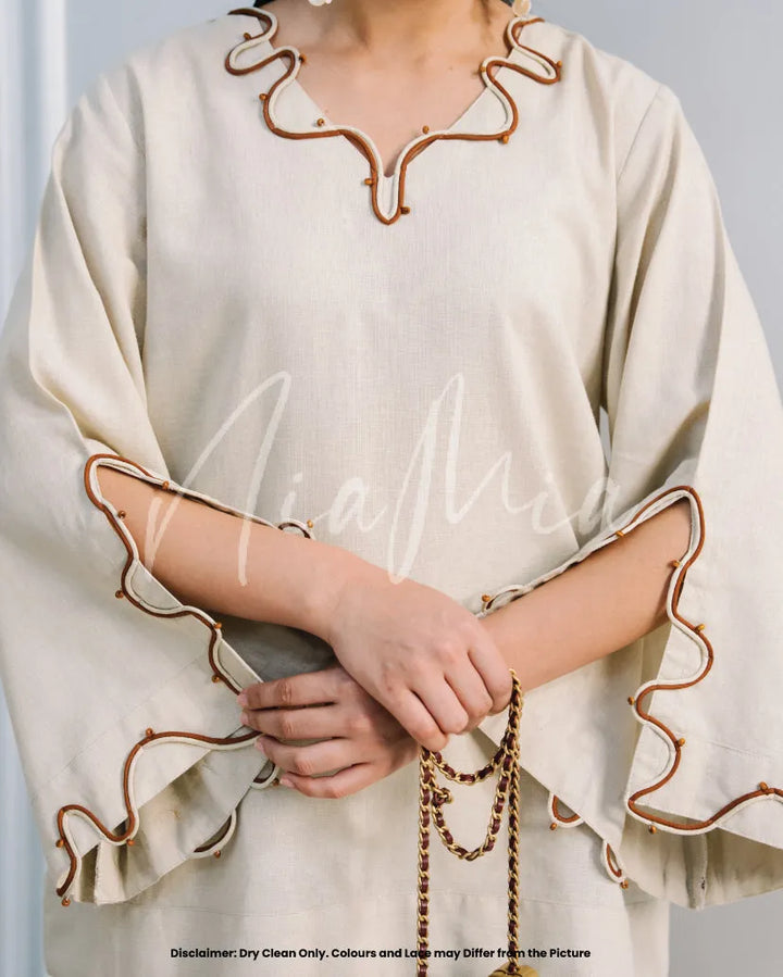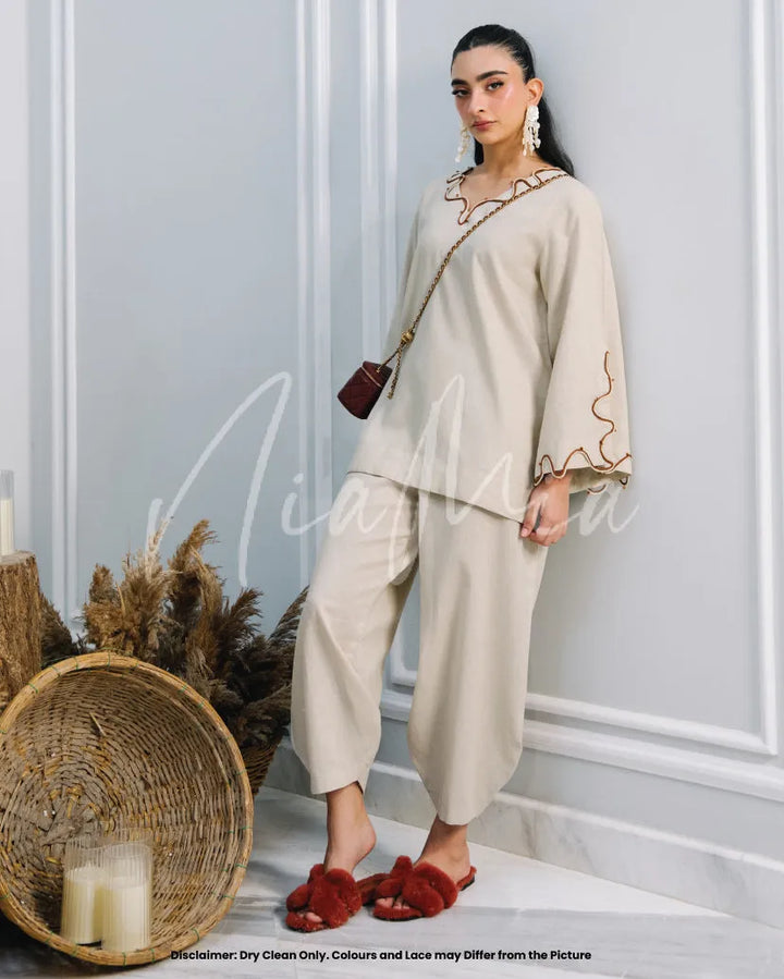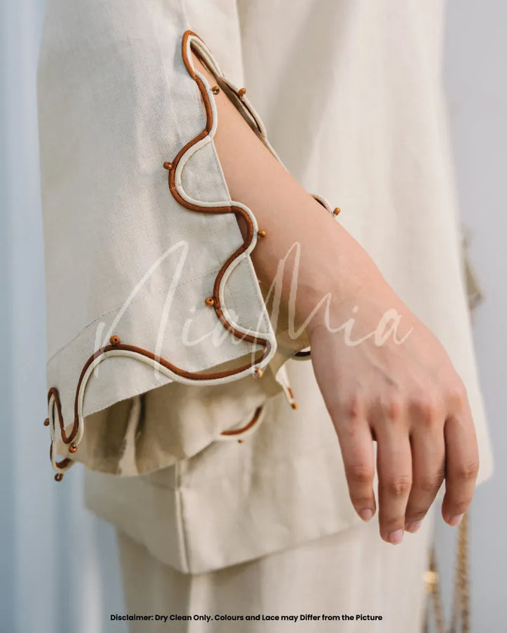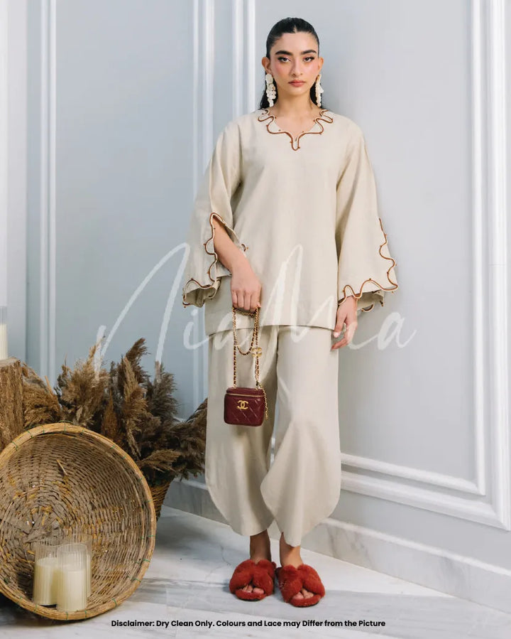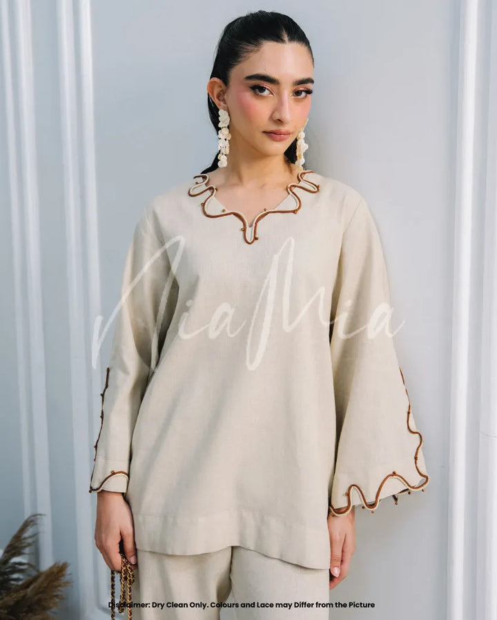 Crafted from soft linen in a timeless neutral hue, Tiramisu embodies effortless sophistication. Featuring Nia Mia’s signature relaxed silhouette with delicate wave detailing along the neckline and sleeves, this co-ord is the perfect balance of comfort and understated elegance for the fall season.