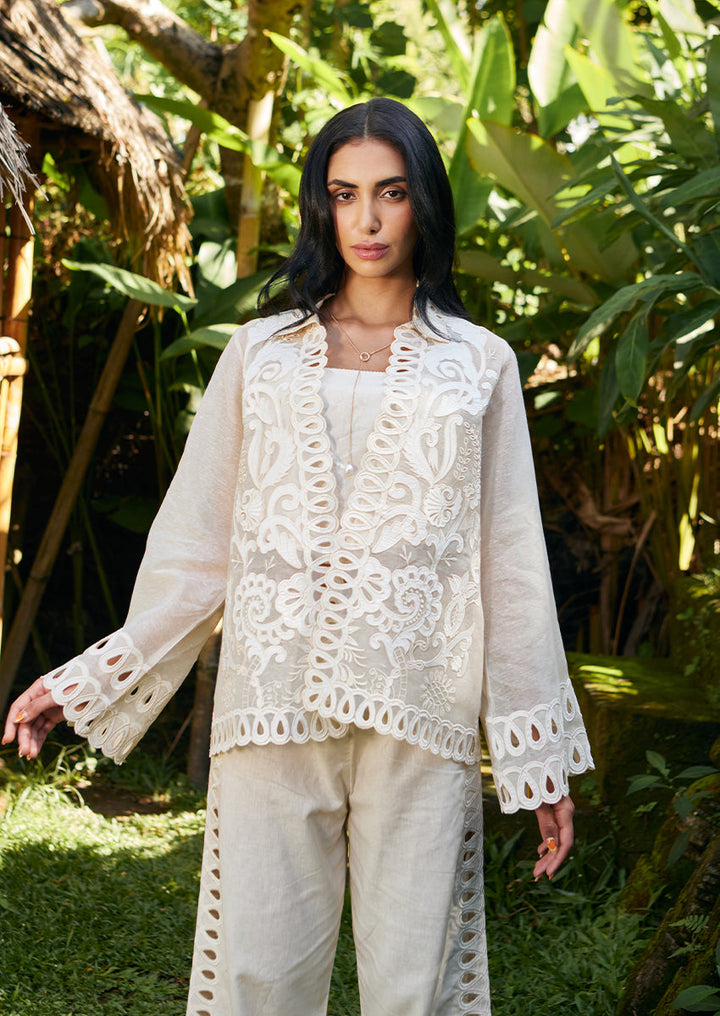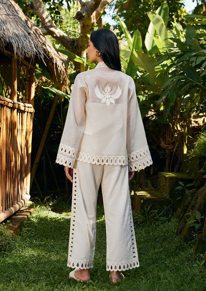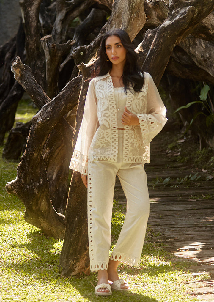 Feel fashionably fierce in this ivory co-ord set. Crafted from sheer khaddi corduroy, the front open jacket makes a statement with its momentous eyelet details running along the borders and the hem of the sleeves. The embroidered applique details create a theatrical mesh that catches the eye, subtly making way for lined khaddi corduroy culottes featuring eyelet details along the entire length and the hem.