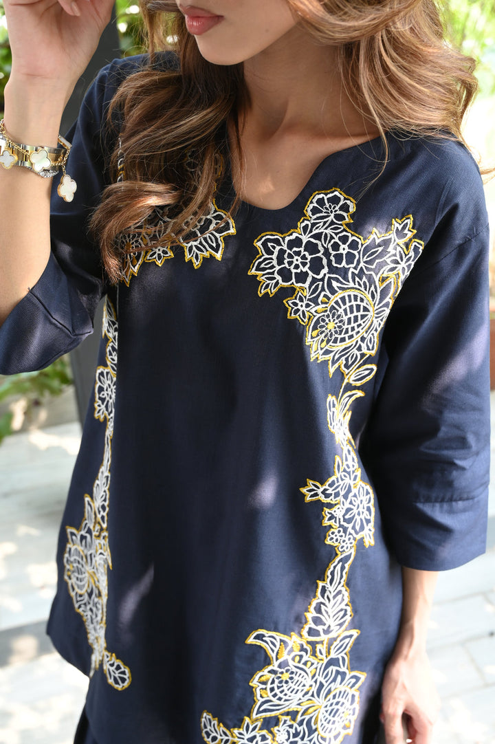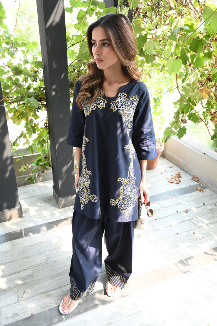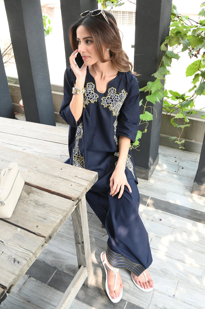 Features a deep navy co-ord set adorned with contrast floral embroidery on the front, paired with Farshi Shalwar finished with striped detailing on the hem.