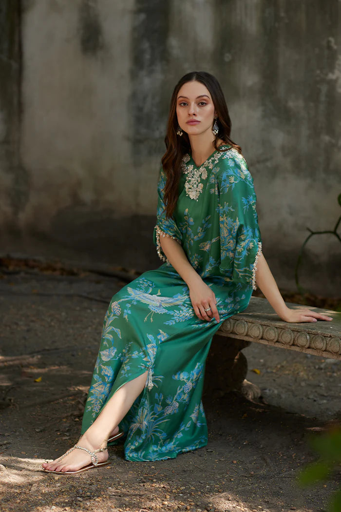 Make a bold statement in our green printed kaftan, crafted from opulent silk and adorned with exquisite 3D work for a striking impression. Handcrafted tassels and intricate beaded detailing elevate this unique piece, inspired by the beauty of Chinese florals and imagery.