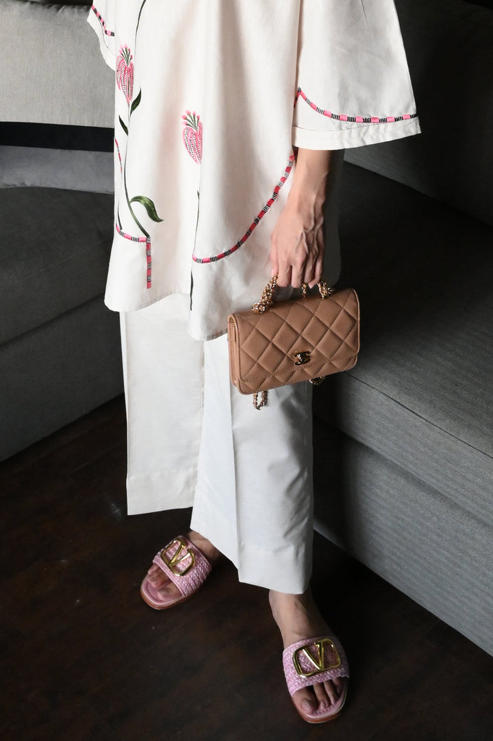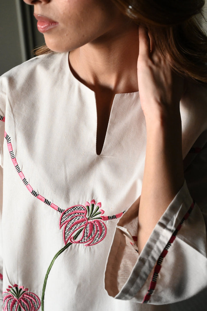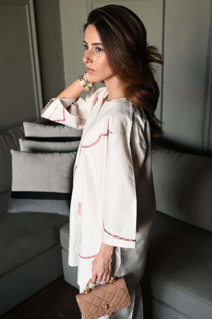 This two-piece ivory linen co-ord set is stitched for structure and ease, made to feel composed even on the busiest summer days. The straight kurta is finished with soft floral embroidery, layered in tonal thread across the front and sleeves. A V-slit neckline and gently flared sleeves give the piece shape without adding fuss.