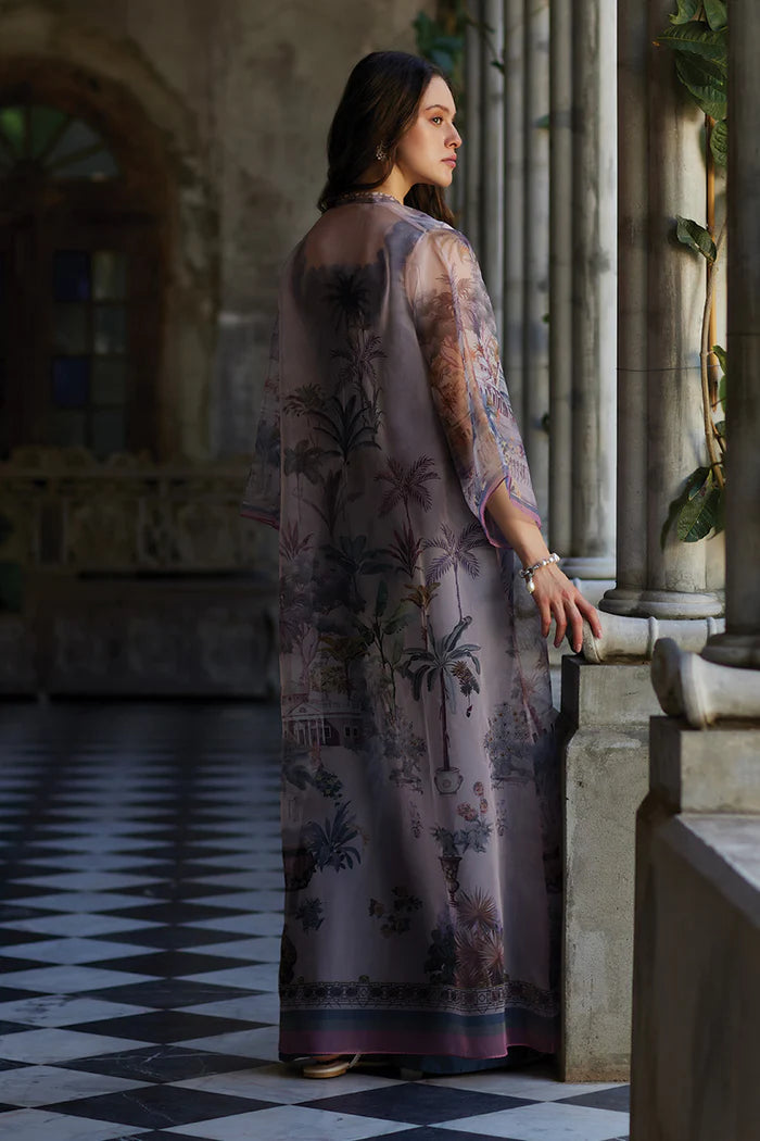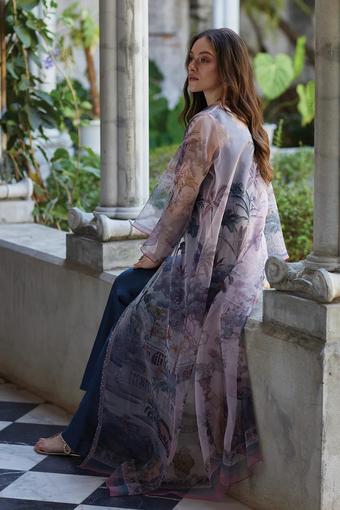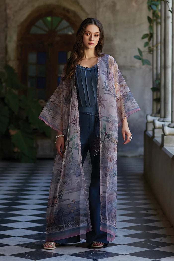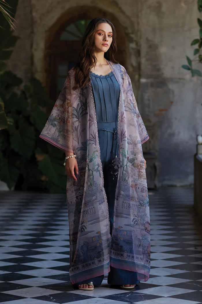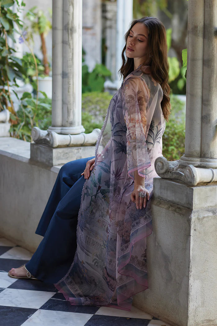 The pink organza jacket, adorned with a lively tropical print, adds a playful touch to any outfit. Paired with grey-blue pure silk cami and coordinating pants, the combination strikes the perfect balance of vibrant and serene, offering a refined yet relaxed look.