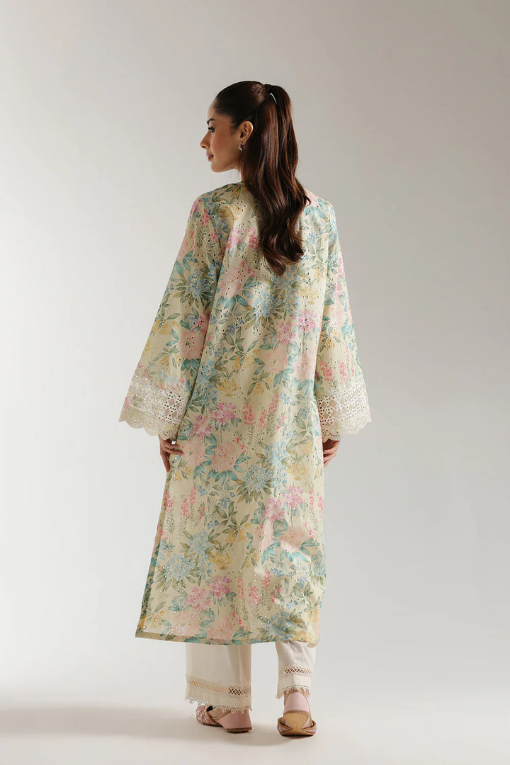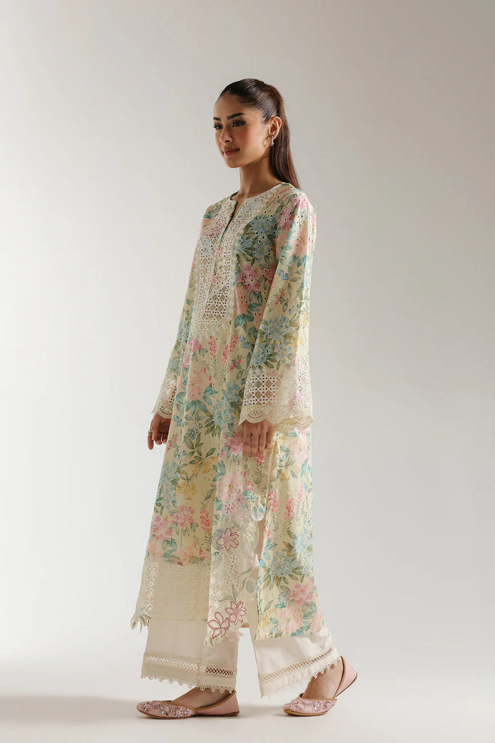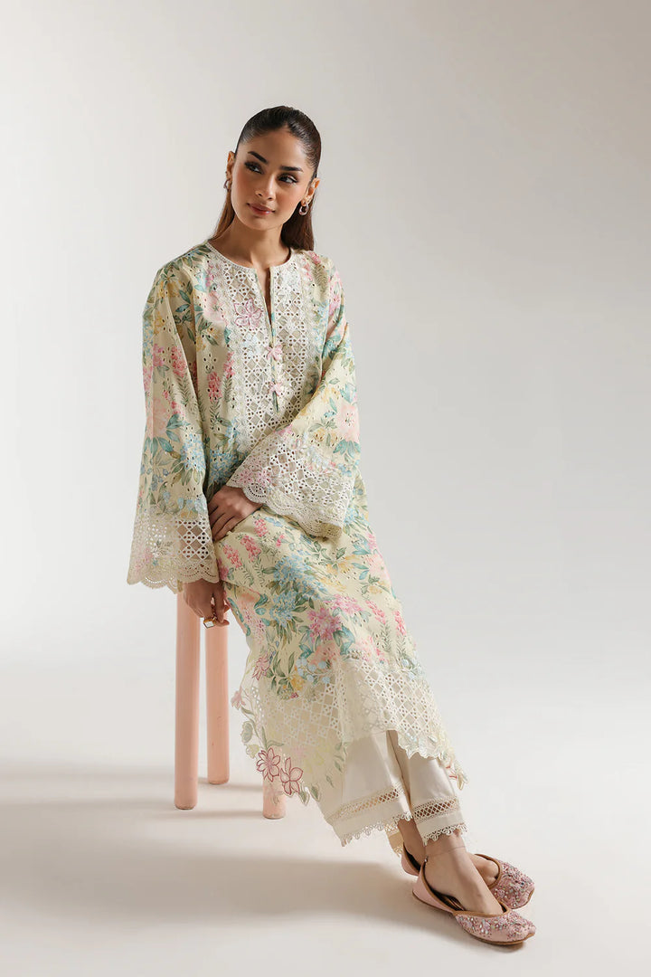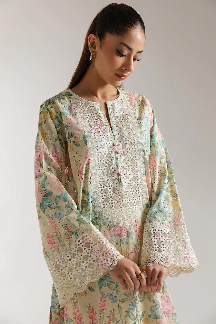 This stylish outfit boasts a classic and elegant design, featuring a subtle yellow beige colored shirt adorned with captivating floral prints in mesmerizing colors and enriched with beautiful schiffli embroidery. The trendy trouser adds appeal with its attractive solid color adorned with delicate laces. This graceful ensemble is a must-have for your summer season wardrobe.