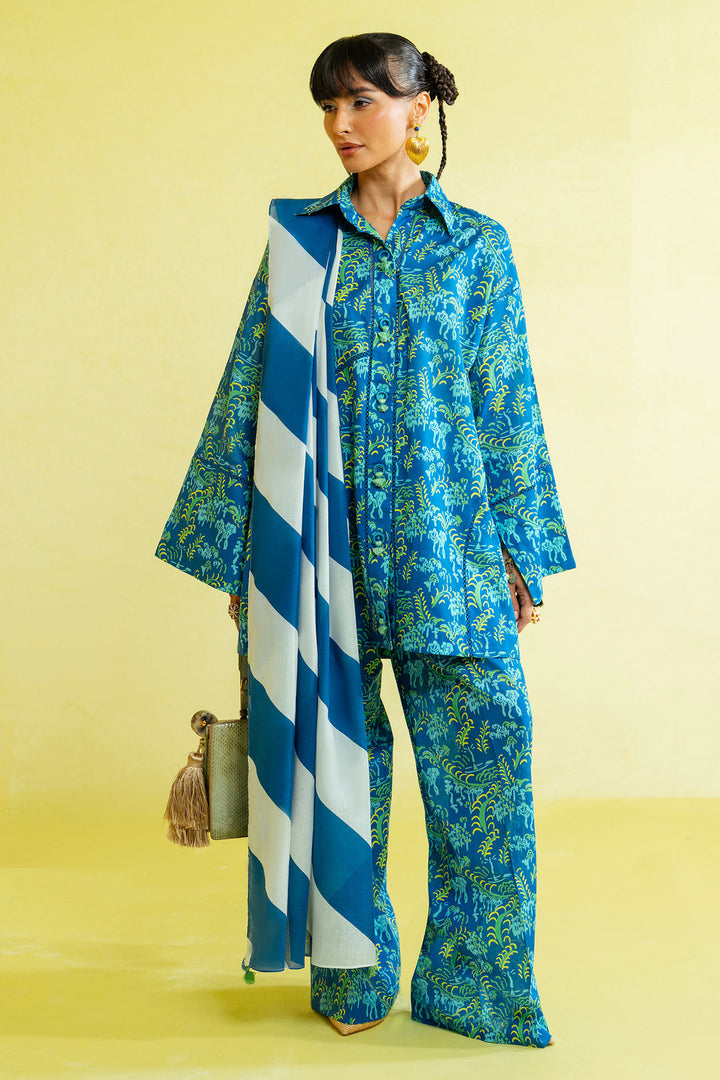 The button-down kurta, relaxed with wide sleeves and a crisp collar, is detailed with playful tassels at the neckline for that easygoing charm. Fresh green botanicals trail across the canvas, keeping the vibe natural yet bold. Paired with matching printed pants and a color-block voile dupatta in shades of blue and ivory, the look is as breezy as it is statement-making.