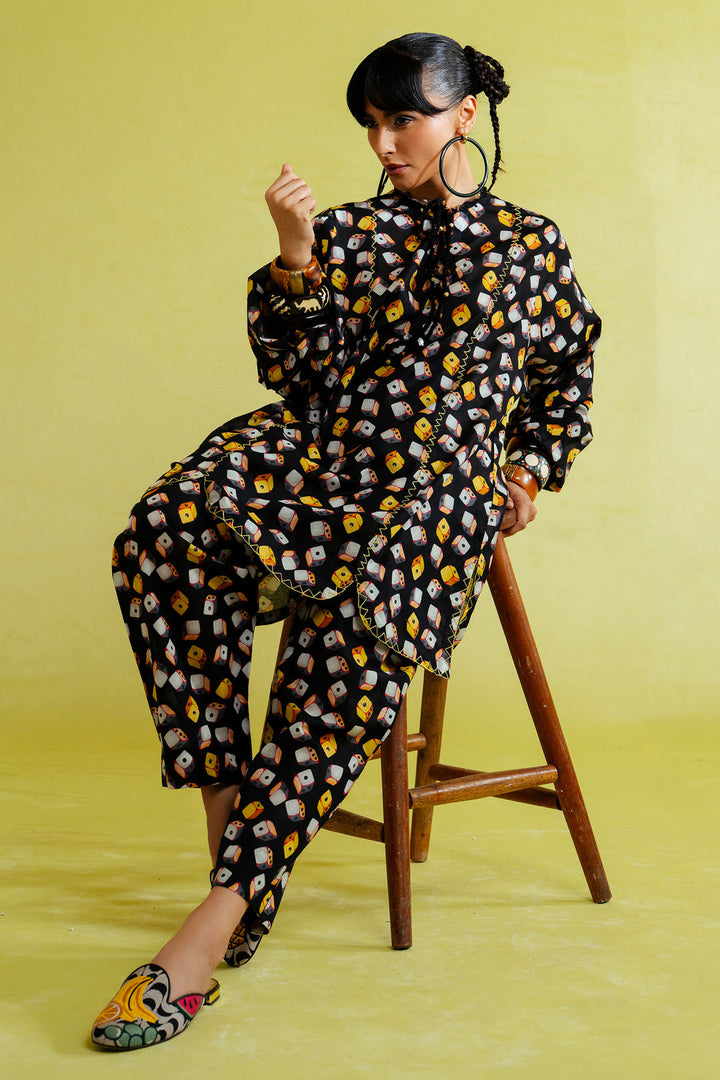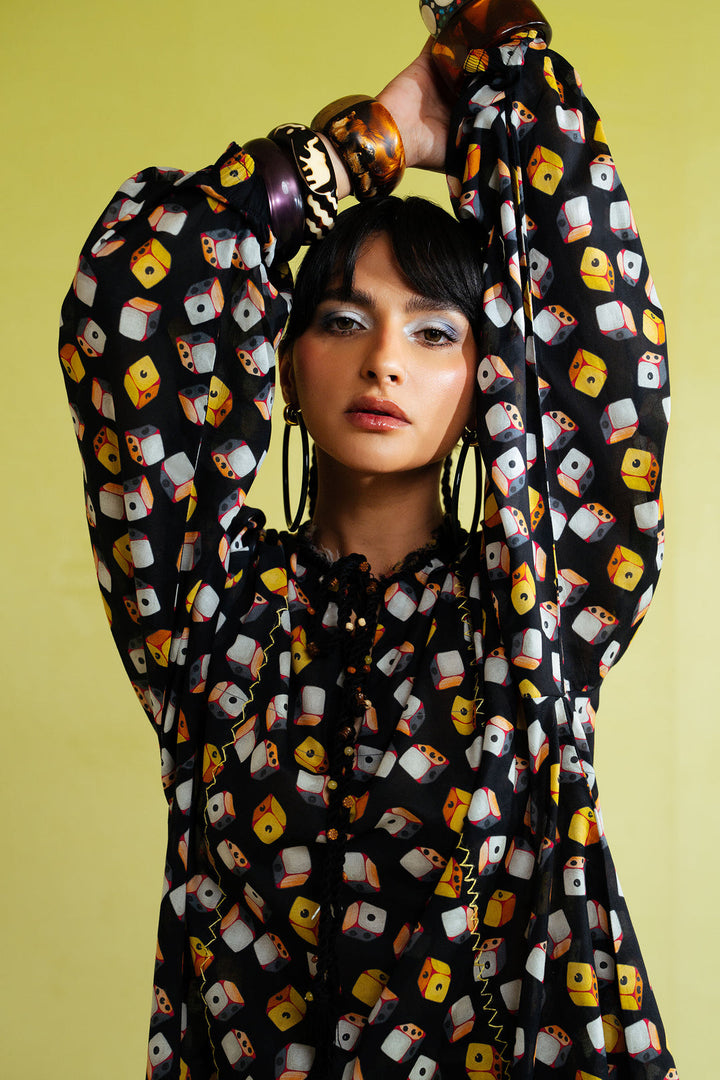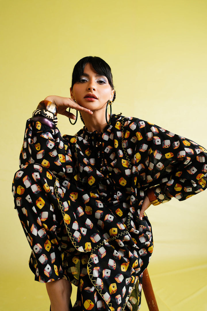 Set on a jet-black base, it’s splashed with a whimsical dice print in pops of saffron, ivory, and crimson — giving just the right amount of statement. Zig-zag stitch detailing adds an edgy touch, while cuffed sleeves keep the silhouette crisp and cool.