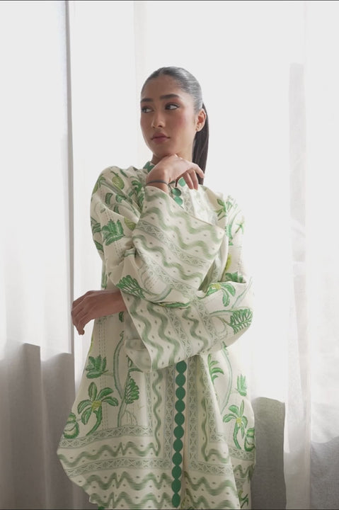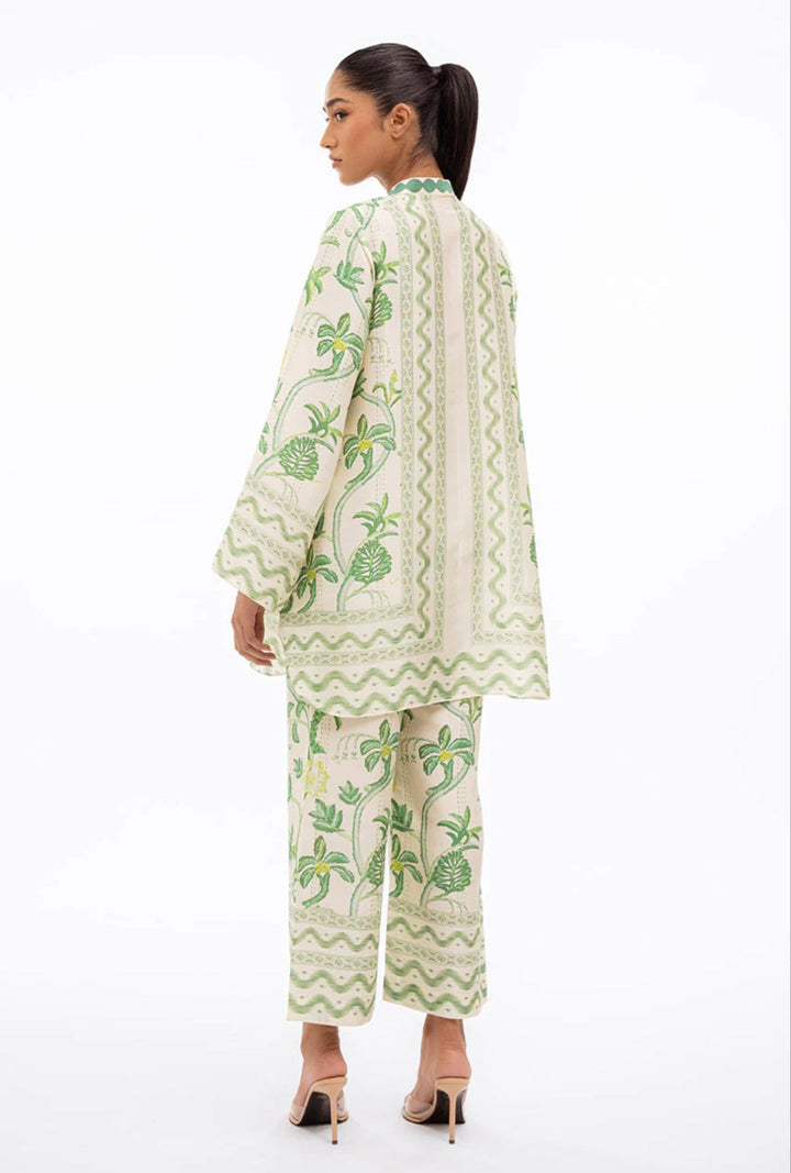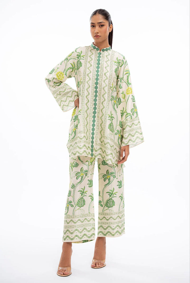 A delicately rendered rawsilk co-ord set is rendered with floral imagery and is framed with a ikat inspired print. The shirt is accented with fabric manipulated details.