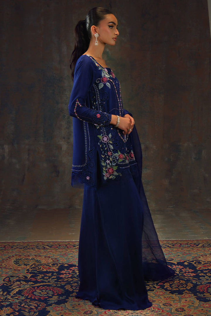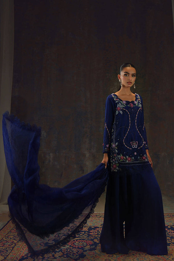 Bathed in the richness of midnight blue pure silk, this Setareh ensemble is a symphony of floral romance and delicate whimsy. The neckline and panels are adorned with intricate hand embroidery—lush roses, trailing vines, and tiny blossoms—interlaced with beaded garlands and charming bow motifs. A beaded butterfly rests gracefully at the hem, adding a playful yet refined touch. Paired with an organza dupatta and flared pure raw silk pants for a modern elegance.