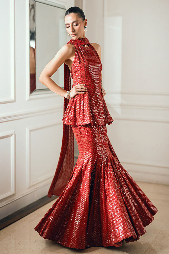 Yasmine is a radiant red sequins-work peplum halter shirt paired with a mermaid-style lehnga, designed to make a captivating statement. The halter shirt shimmers with delicate sequin embellishment, while the lehnga is finished with a graceful kankan that adds volume and movement to the silhouette.