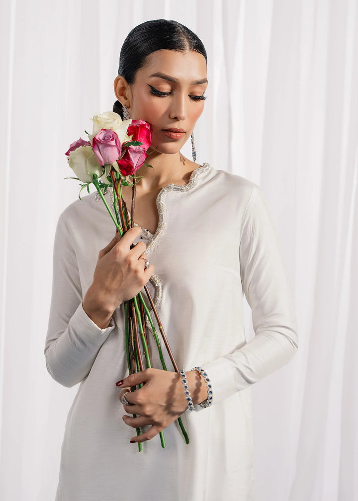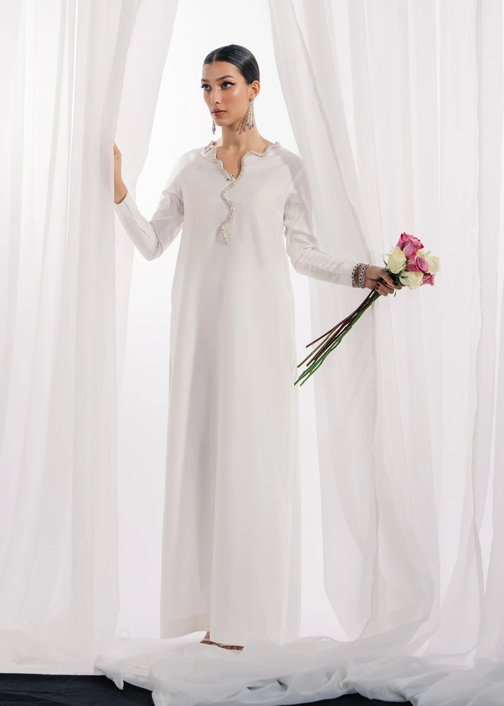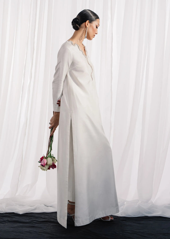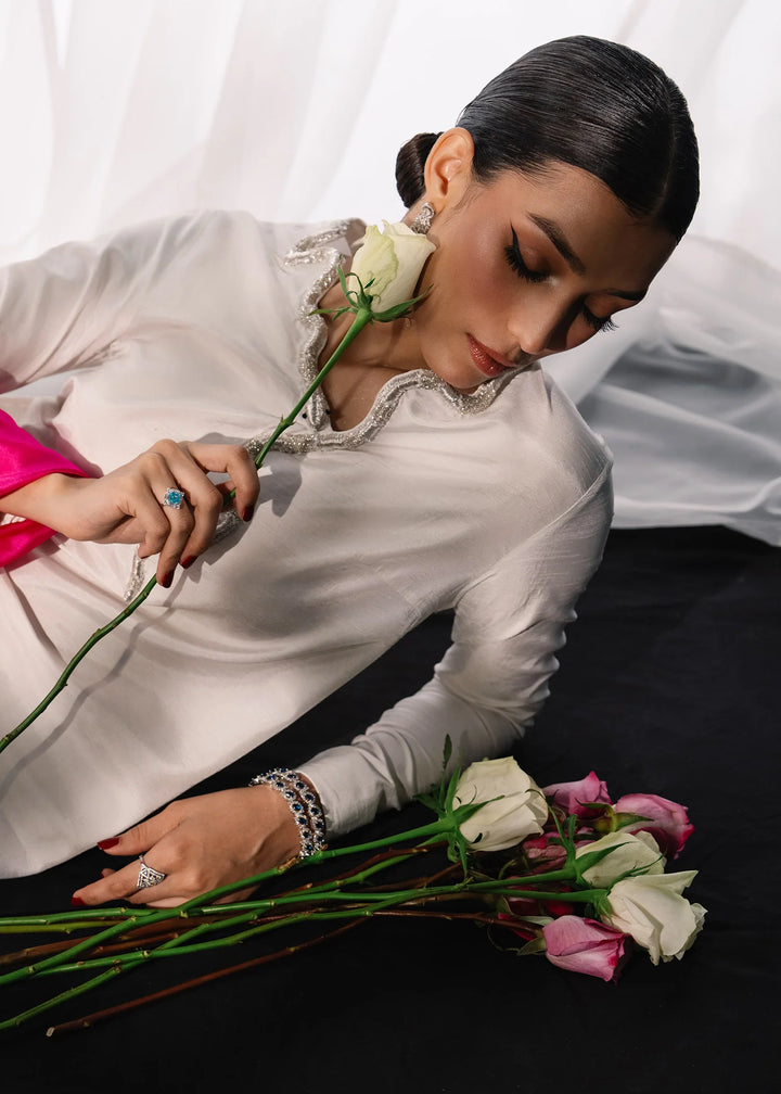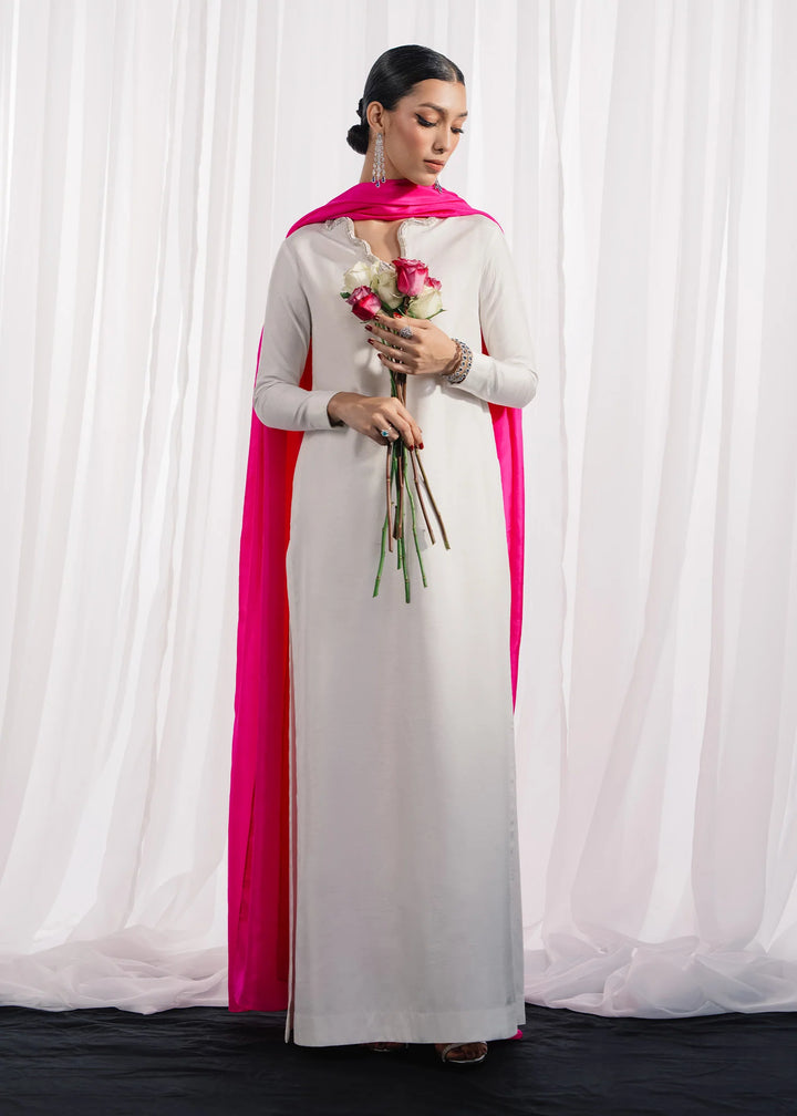 Flowing length white silk set with a long silver and worked serpant shaped neckline. Offset with medium silk barbie pink dupatta.