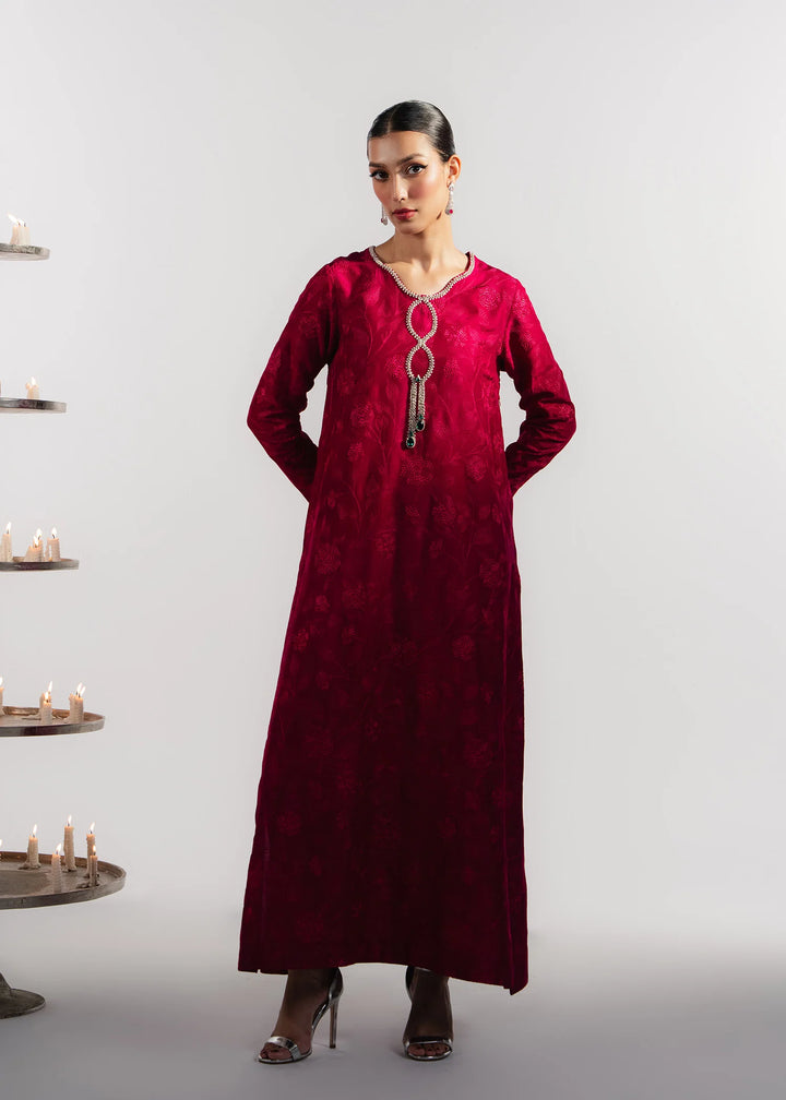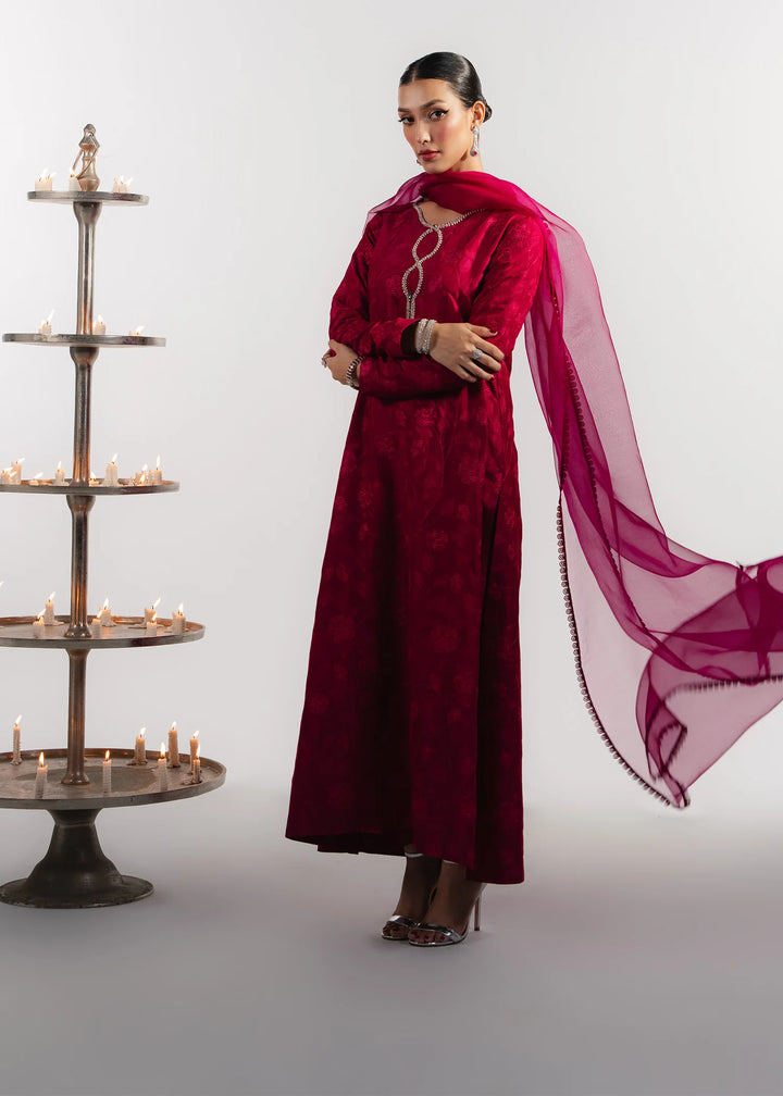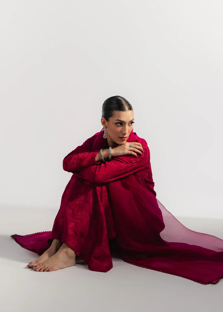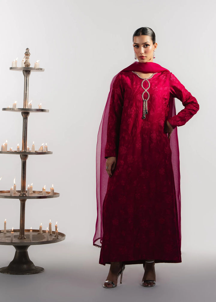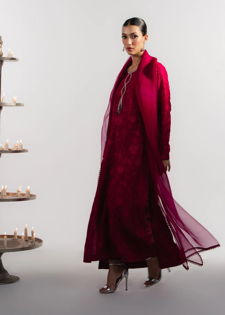 Heavily embroidered cherry tones silk with a handcrafted flowing neckline. Paired with matching organza dupatta.