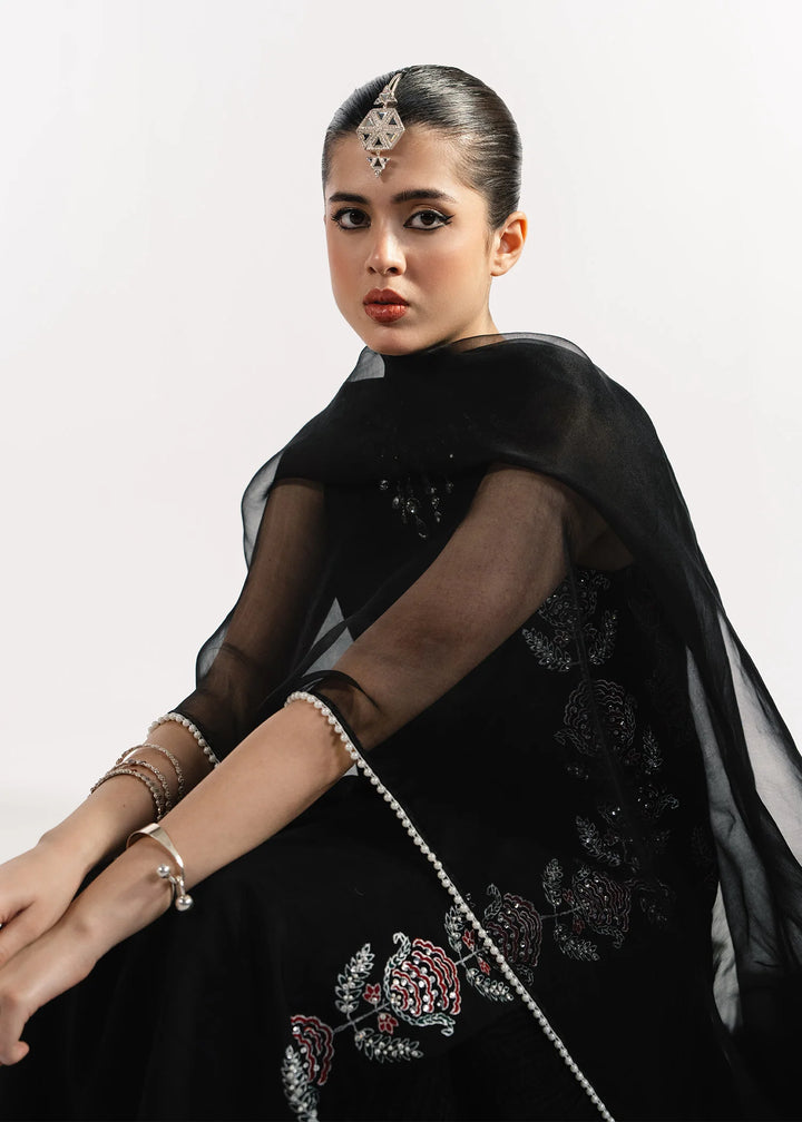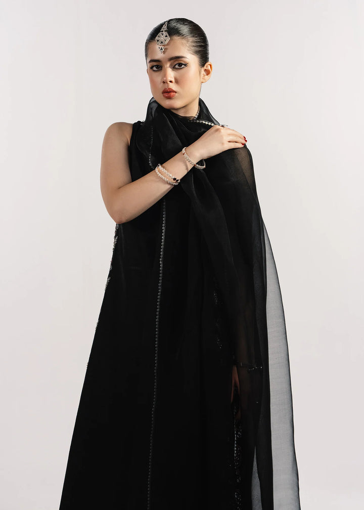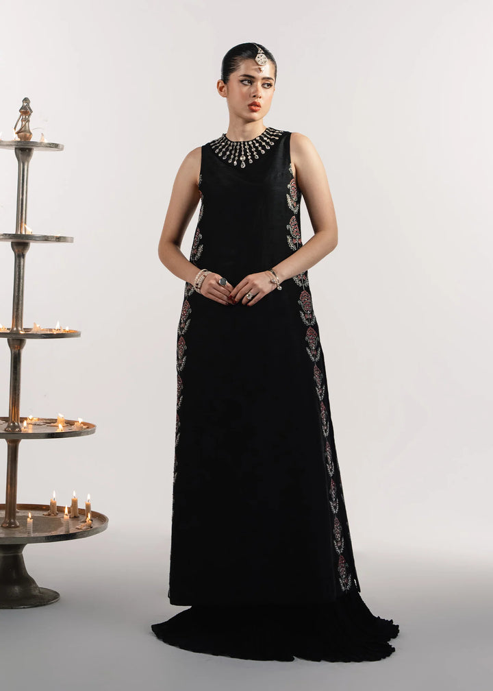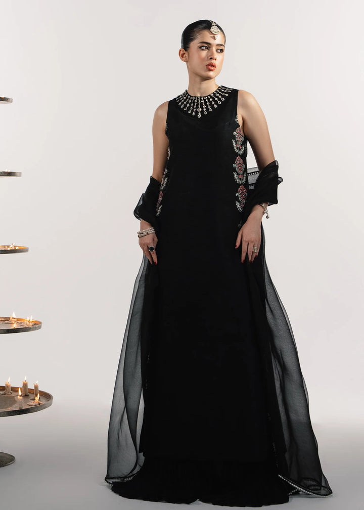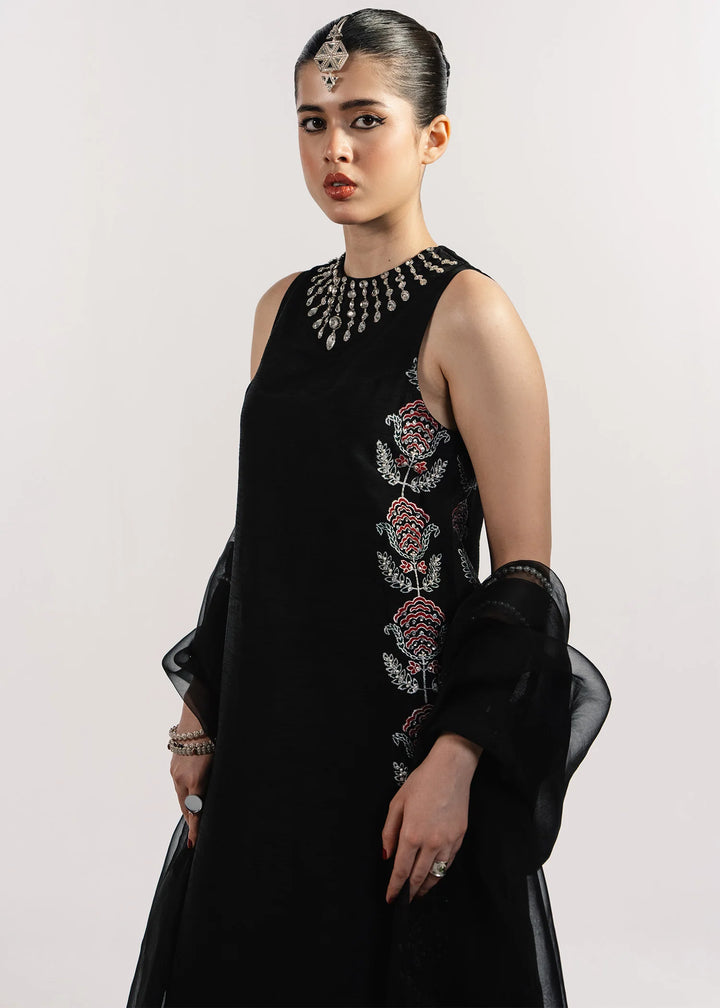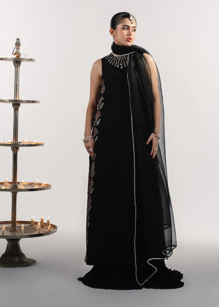 Timeless classic black silk long shirt with crushed sharara pant. Block printed on the sides, this silk set features a peacock feather inspired hand crafted crystal neckline and an organza dupatta to match.