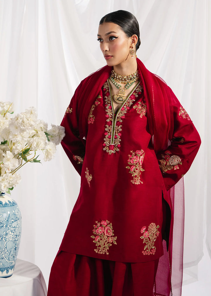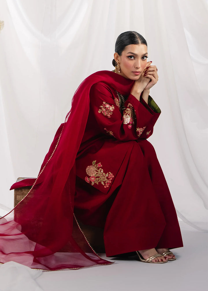 Deep red blockprinted festive set with block printing and handworked delicate resham neckline.