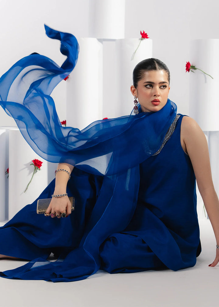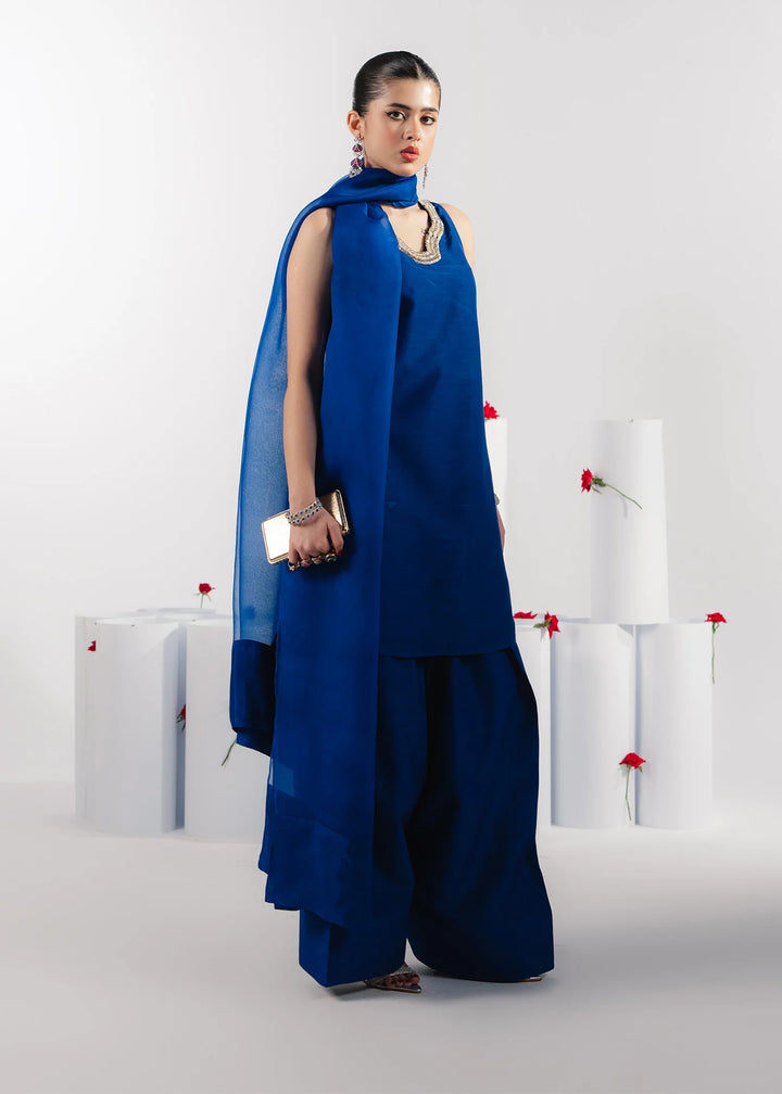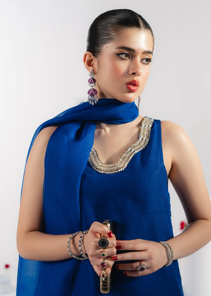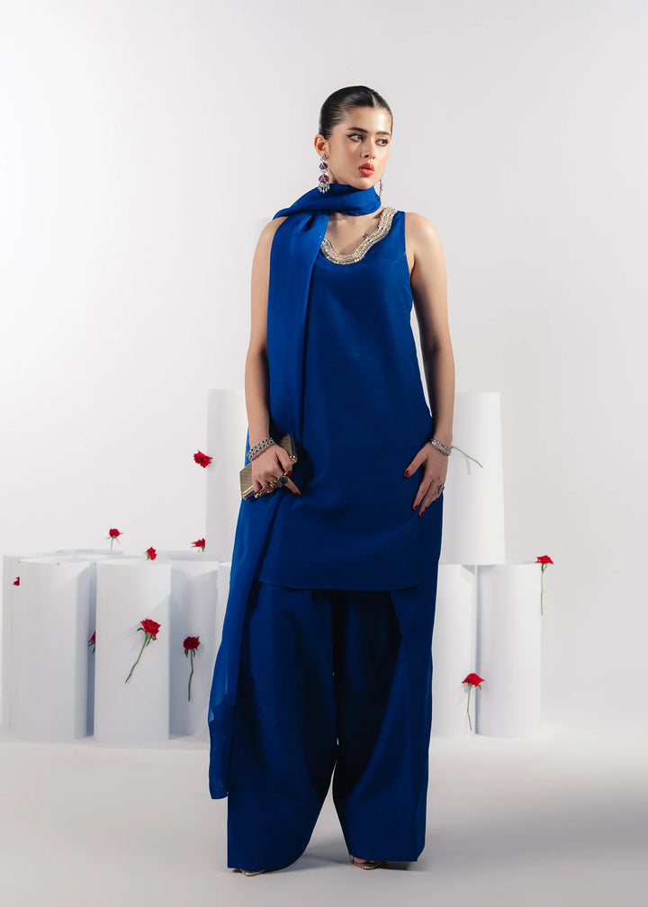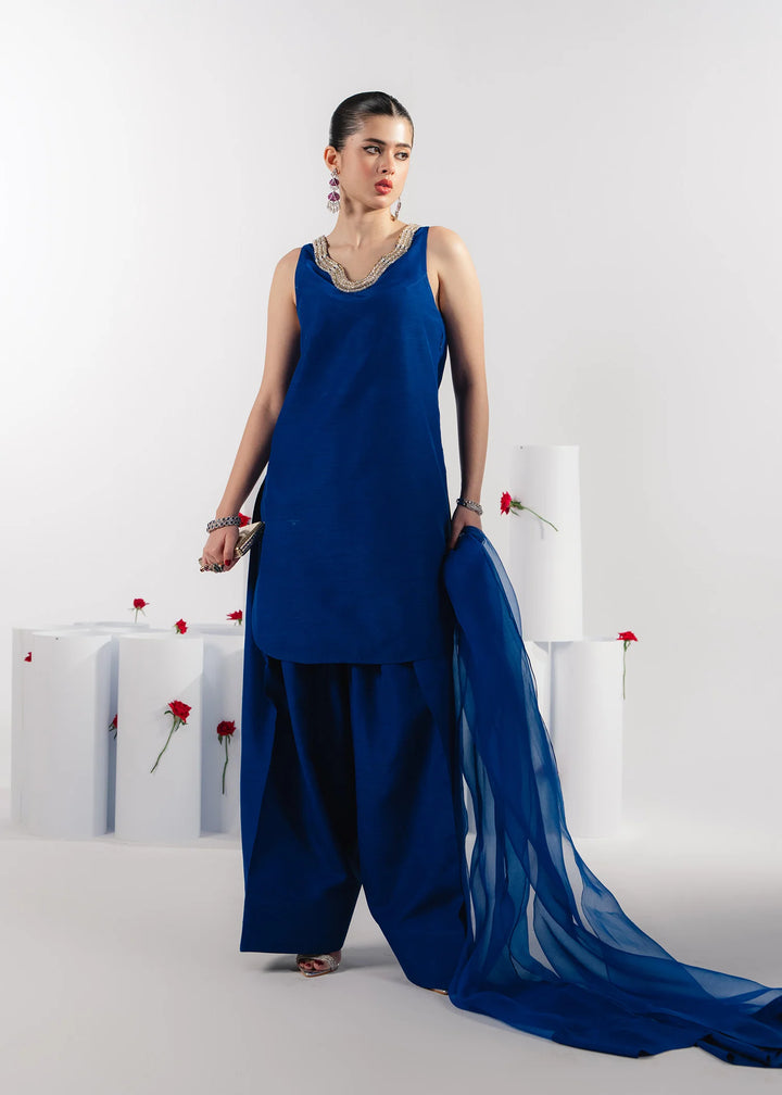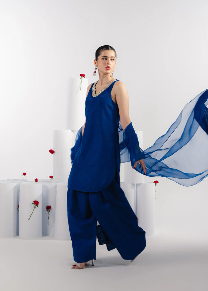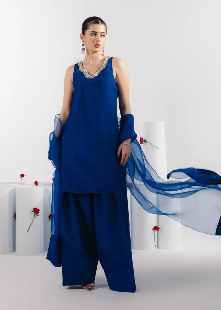 Cobalt blue round hem shirt paired with a farshi shalwar. Handcrafted wave pattern bejewelled neckline.