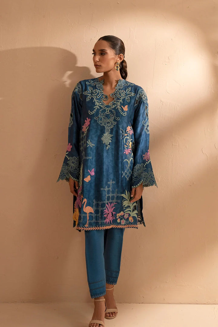A vibrant teal hued ensemble in embossed sheesha silk is embroidered with playful appliques and resham details in vibrant pink, verdant green and yellow hues. The silhouette is elevated with scalloped hemline and plain khaadi silk dupatta, tailored to perfection! Pair it with a tapered shalwar for a glamourous look this festive season!
