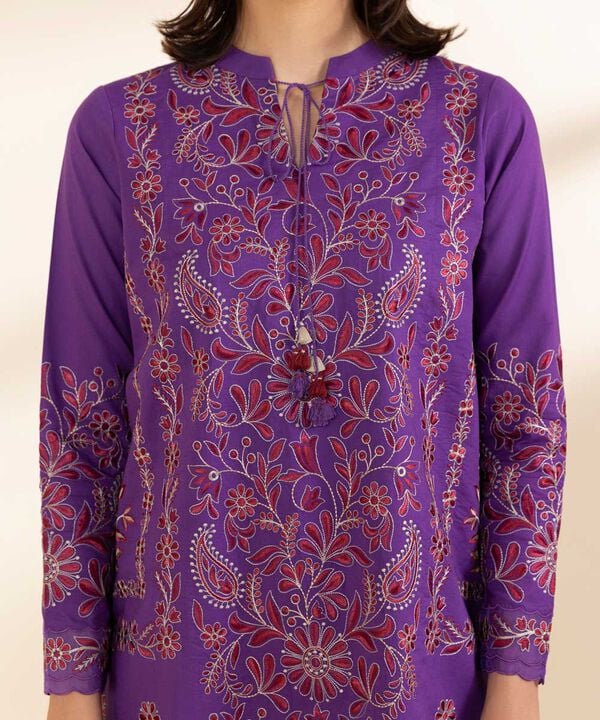 Make a statement with our three-piece embroidered ensemble in amethy purple and red featuring a cotton shirt and trousers paired with a blended chiffon dupatta.