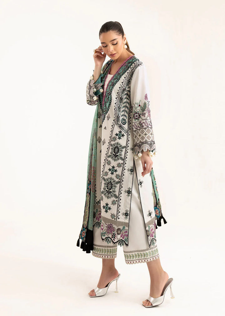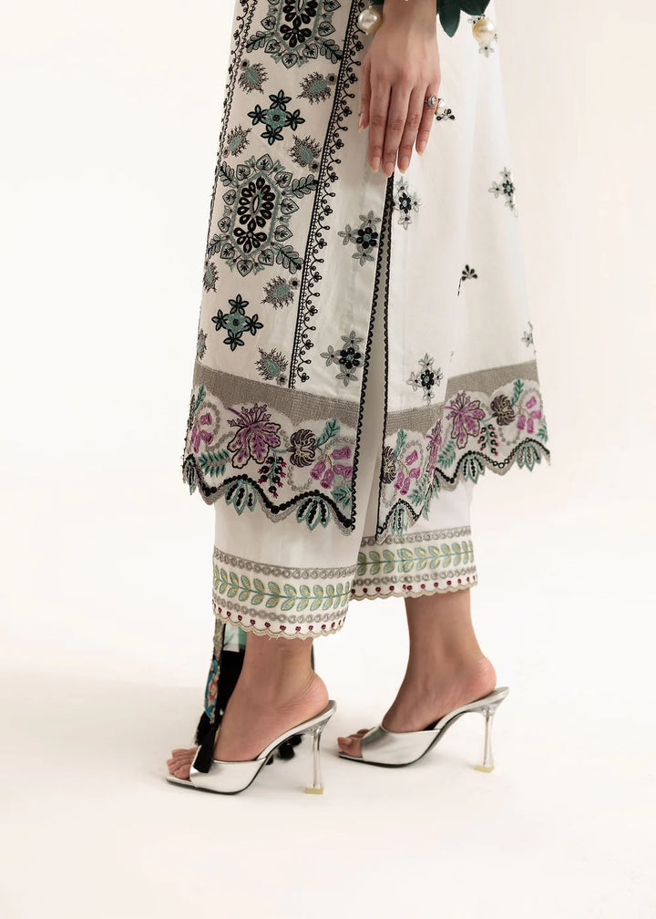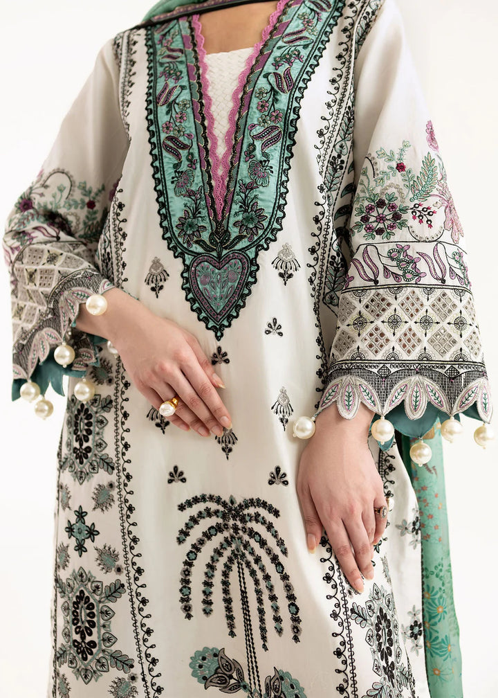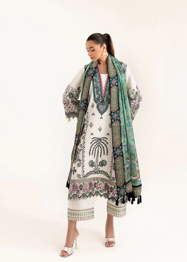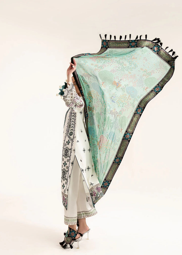 Additional Description: Palms trees and dancing floral vines take centre stage on this gorgeous summer design. A panelled chikankari base comes with an elongated contrasting neckline in charmeuse silk to match the color offset of a digitally printed shikar gah inspired silk dupatta. Care Instructions : 1- Do not bleach or use stain removing chemical 2- Dry in shade 3- Iron at moderate temperature 4- dry clean only 5- wash colors and whites seperately