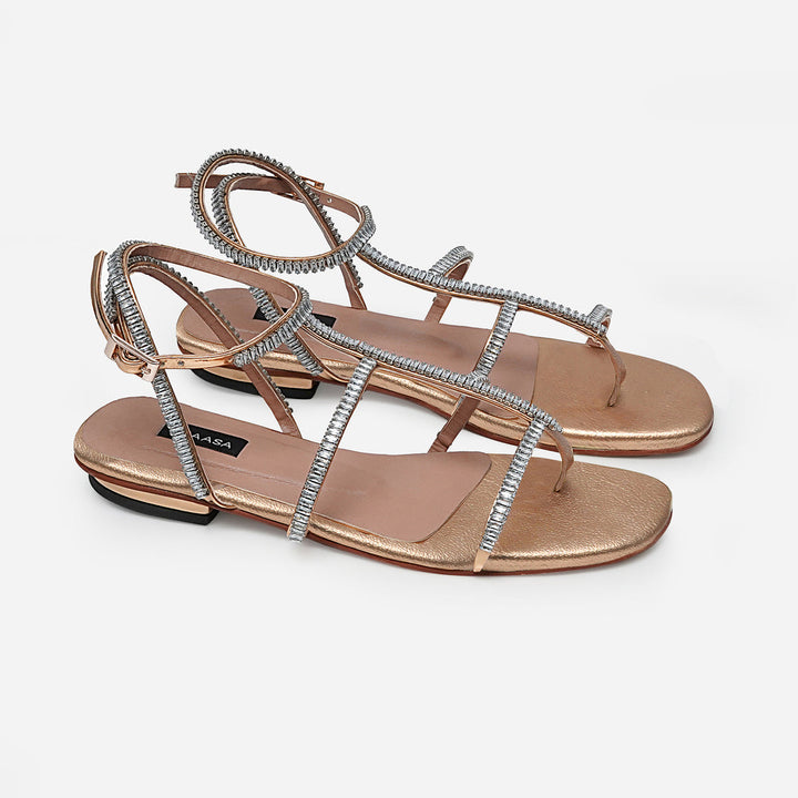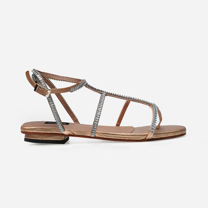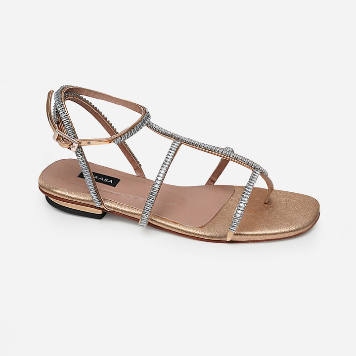 Afsaneh' features a mirrored gold insole with straps embellished in crystal chains. The sculpted toe loop adds definition, while the slim ankle strap offers a secure,