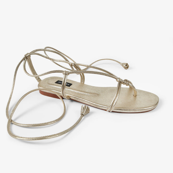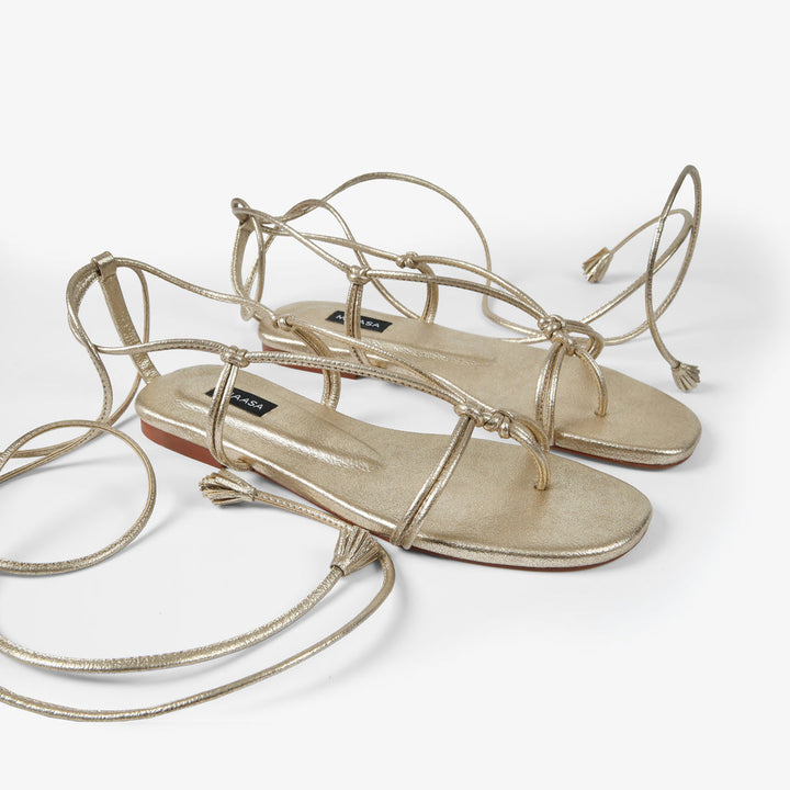 Step into subtle shine with the 'Parisa' Metallic lace-ups. Crafted in a radiant gold tone, these sandals feature a minimalist thong silhouette with extended laces that wrap delicately around the ankle for a custom, secure fit. The soft cushioned sole ensures all-day comfort, while the metallic finish adds a touch of statement to both casual and festive looks.