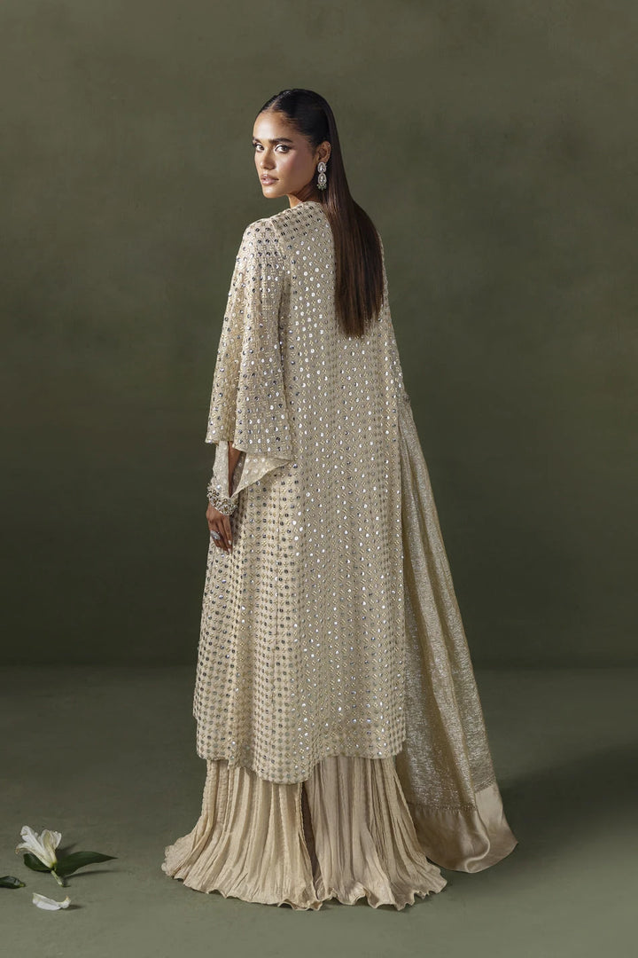 This ivory 3-piece luxury formal captures sophistication with its intricate details and elegant silhouette. The shirt features an all-over sequined pattern, beautifully accentuated by our laboriously crafted bead-work. The neckline is adorned with pearl, resham, and mirror work that further enhances its charm while statement sleeves with embellished cuffs lend a contemporary touch. The ensemble is put together with a beautiful shimmering dupatta and crushed pants, adding radiance to your festivities.