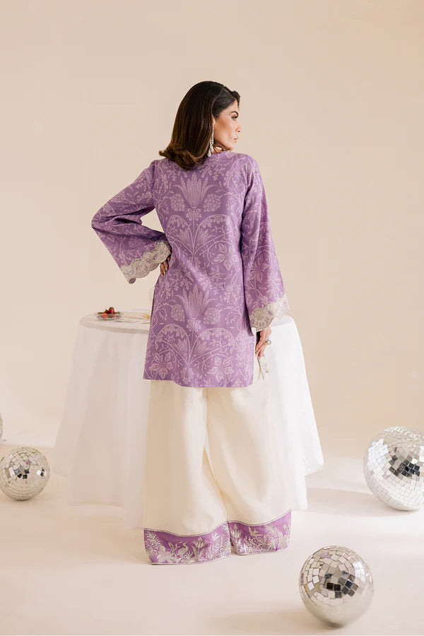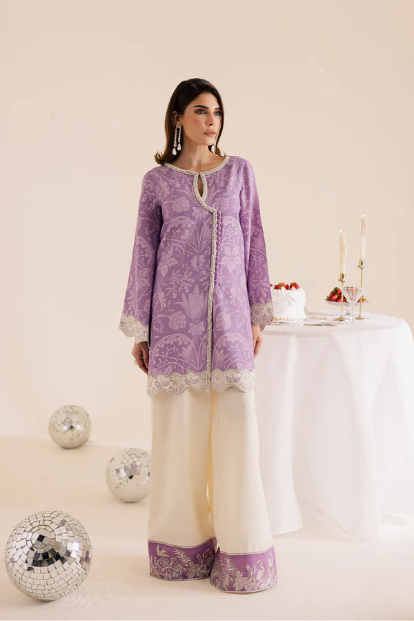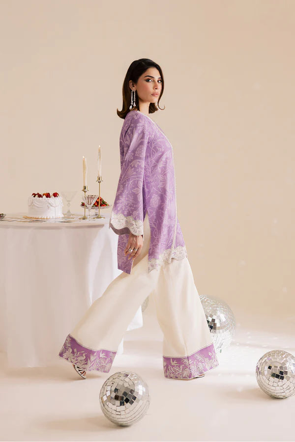 A lilac lawn silk printed shirt with embroidery and embellishments, paired with off-white flared trousers