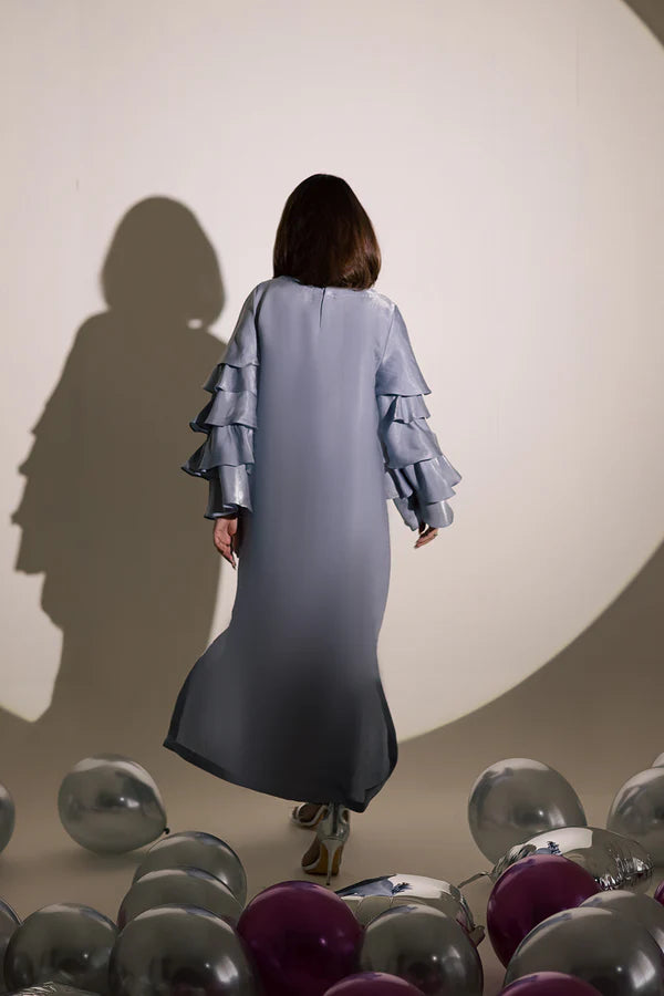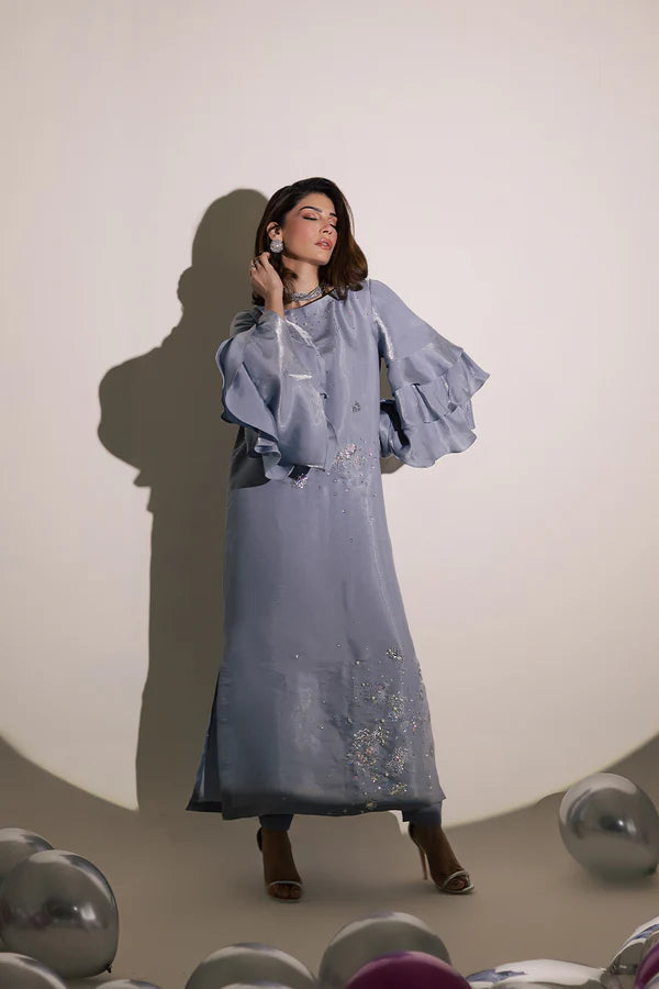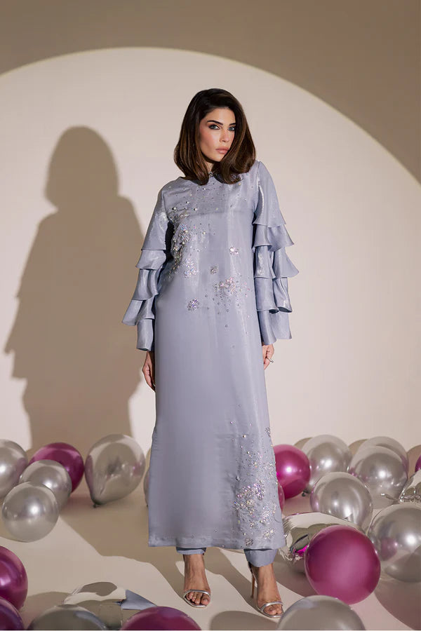 Shimmery silk shirt with delicate embroidery and hand embellishments, featuring ruffled sleeves. Paired with tailored silk cigarette pants for a chic, elegant look.