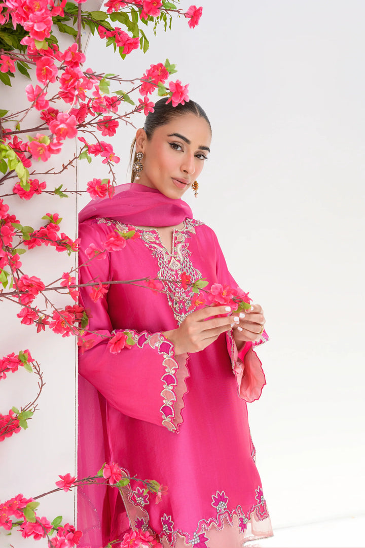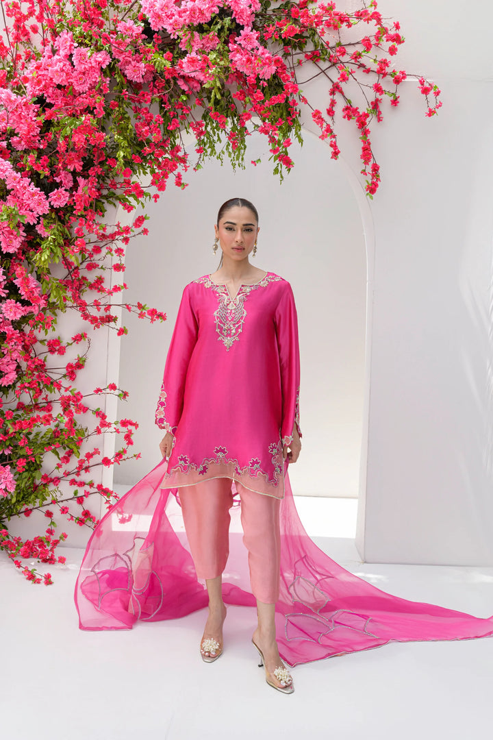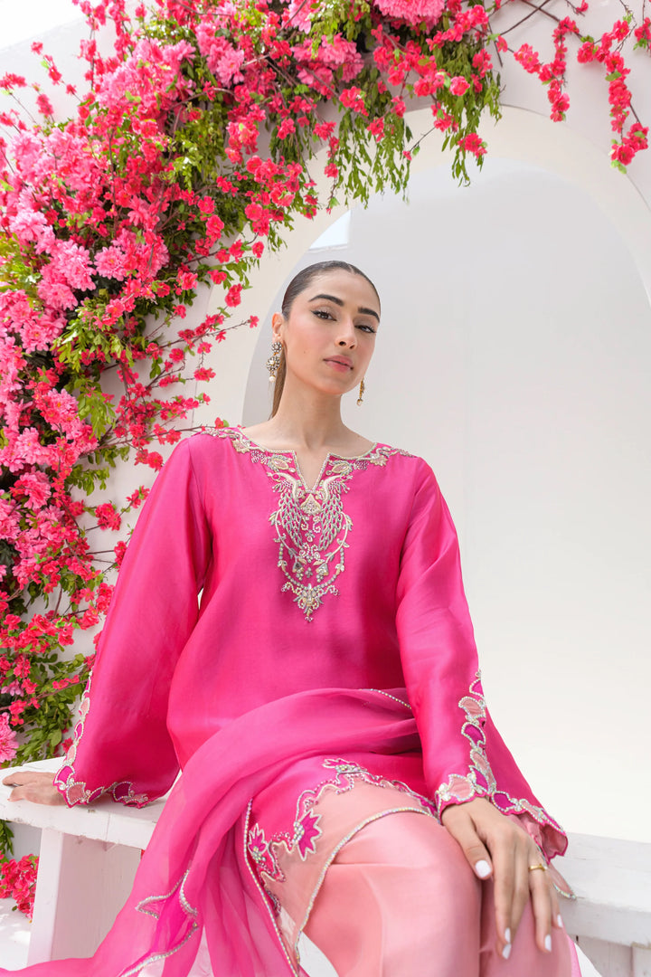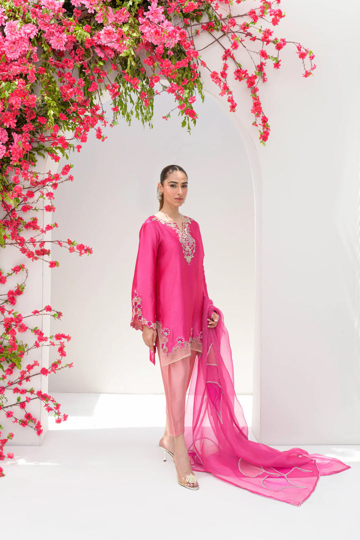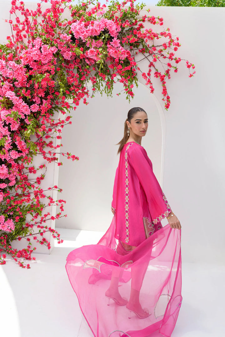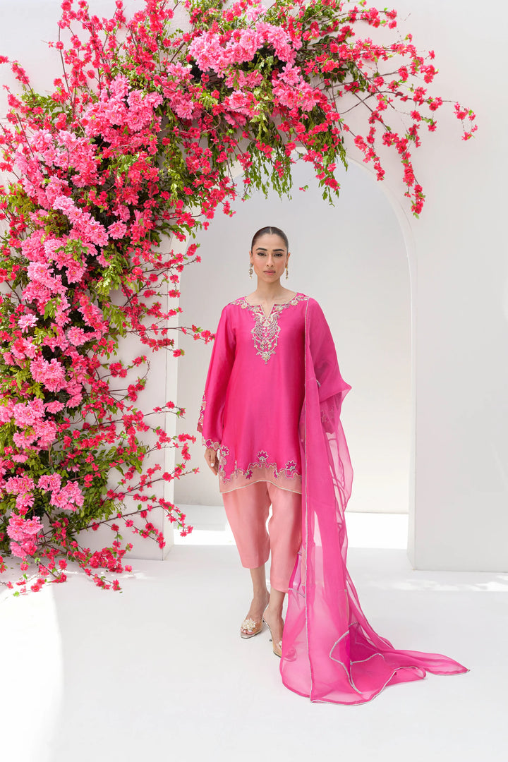 A playful pink-toned ensemble featuring a vibrant fuchsia shirt paired with a candy-colored shalwar, both crafted from luxurious pure Sheesha silk. The outfit is richly adorned with detailed handwork—Dabka, Kora, Resham, and intricate appliqué. The pure Kattan organza dupatta steals the spotlight with heavy appliqué detailing and shimmering Swarovski stones, adding a touch of glamour to this statement look.
