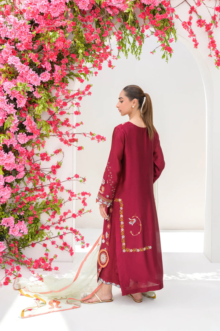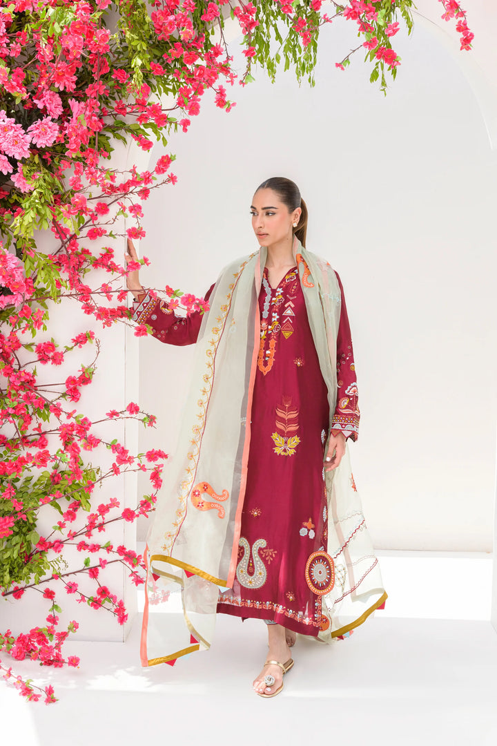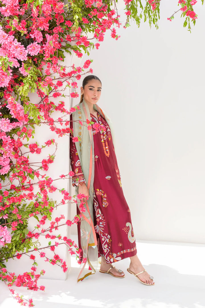 Cherry Pie is a deep maroon long shirt paired with an apple green dupatta. Crafted from pure sheesha silk, the shirt and pants exude luxury, while the dupatta is made from delicate kittan organza. Both the shirt and dupatta are richly adorned with intricate machine embroidery in shades of ice blue, rust, and sage green, offering a perfect blend of tradition and elegance.